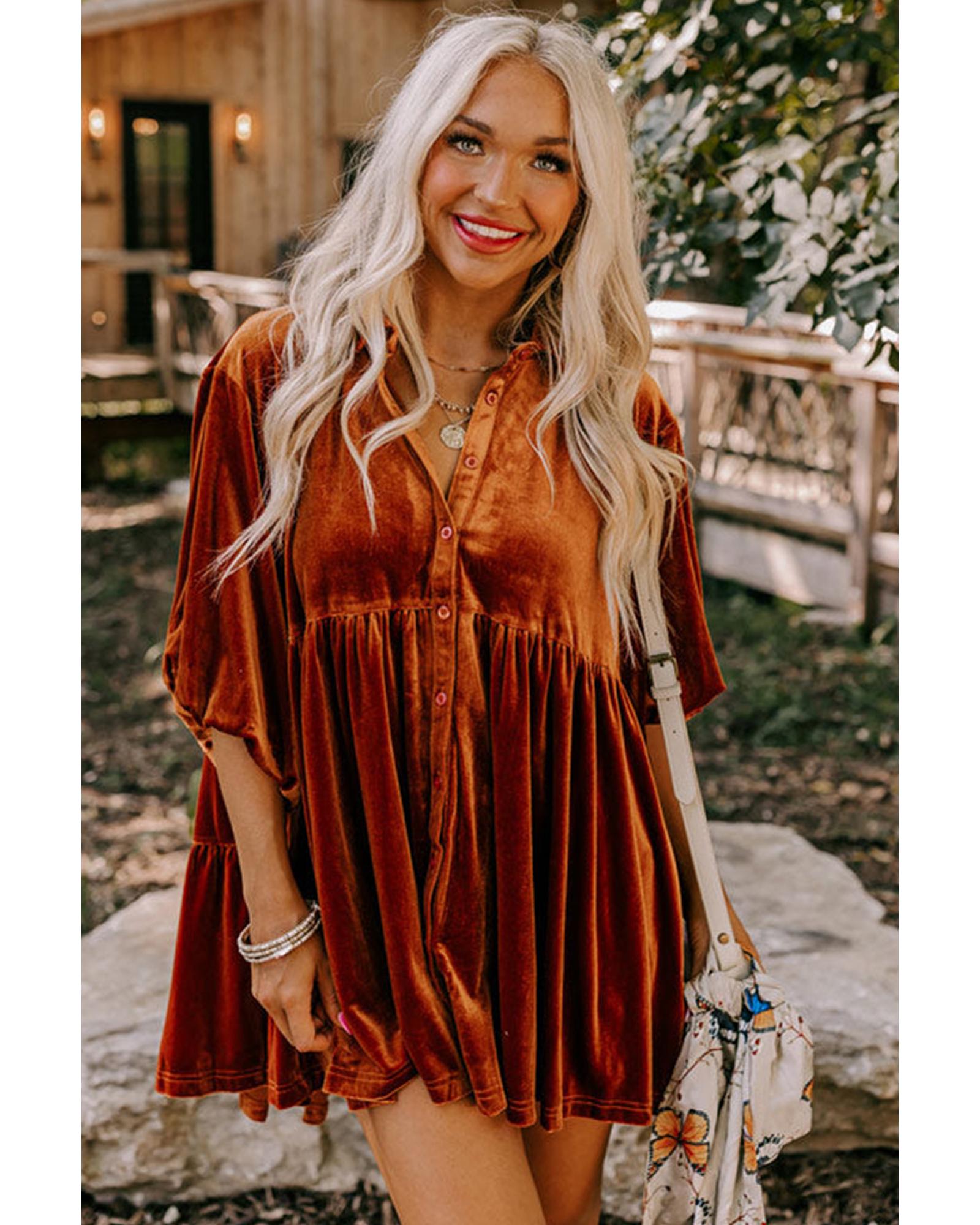 Azura Exchange Chestnut 3/4 Sleeve Tunic Babydoll Velvet Shirt – S