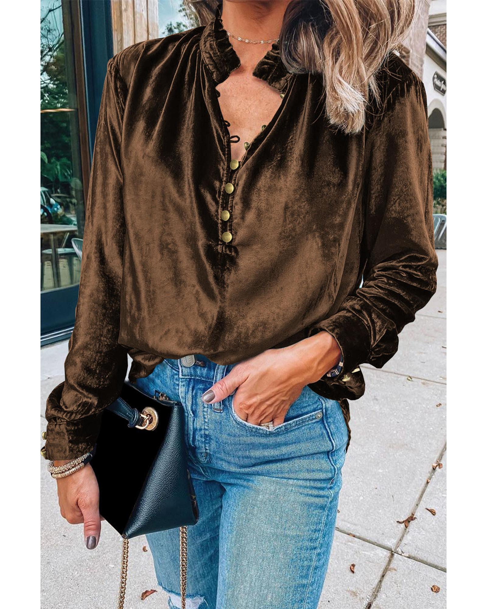 Desert Palm Frilled Neck Buttoned Front Velvet Top – S