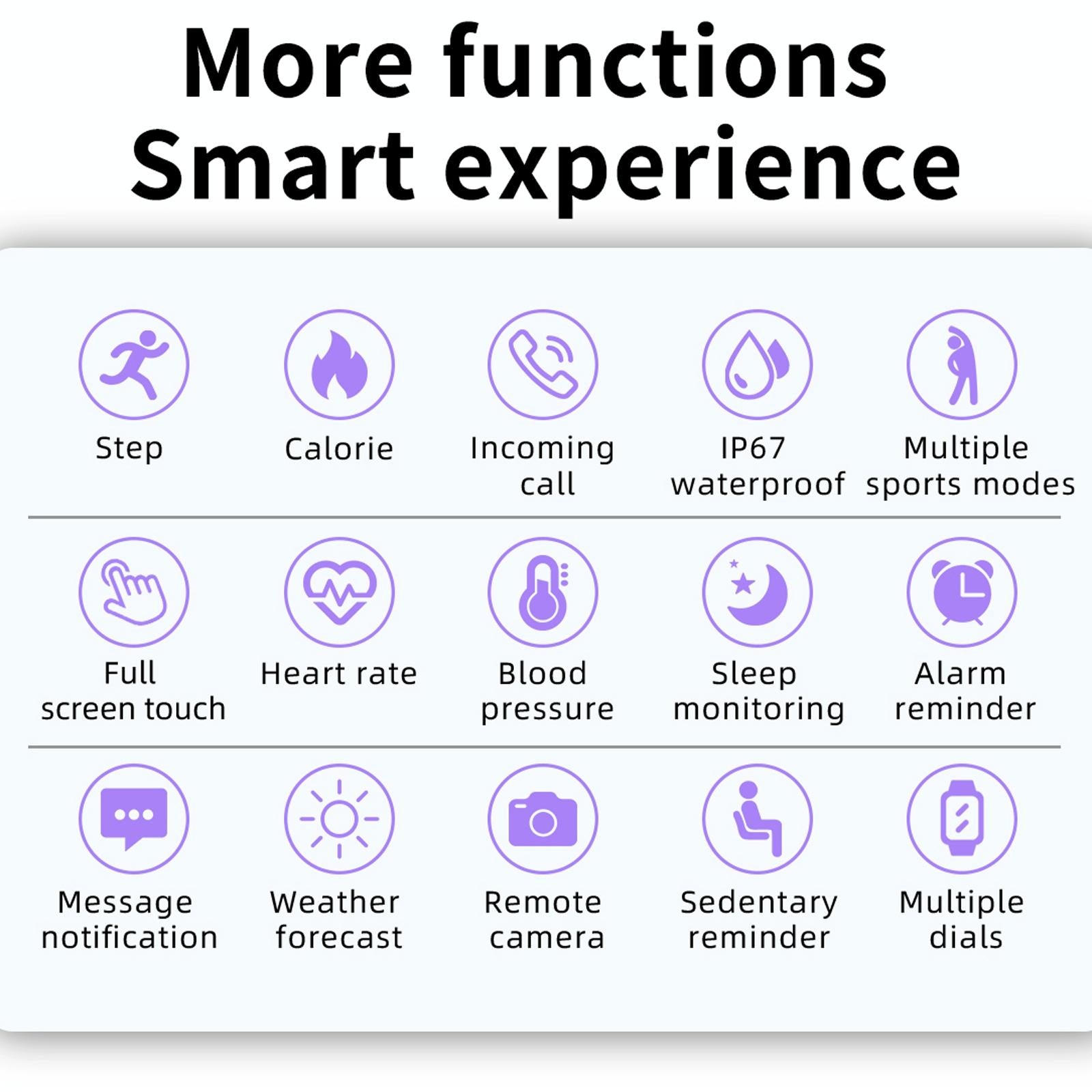 • Functions include mileage, calories, steps, sleep monitoring, heart rate monitoring, blood pressure monitoring, shake or click to take a photo, message reminder, call reminder, and sedentary reminder