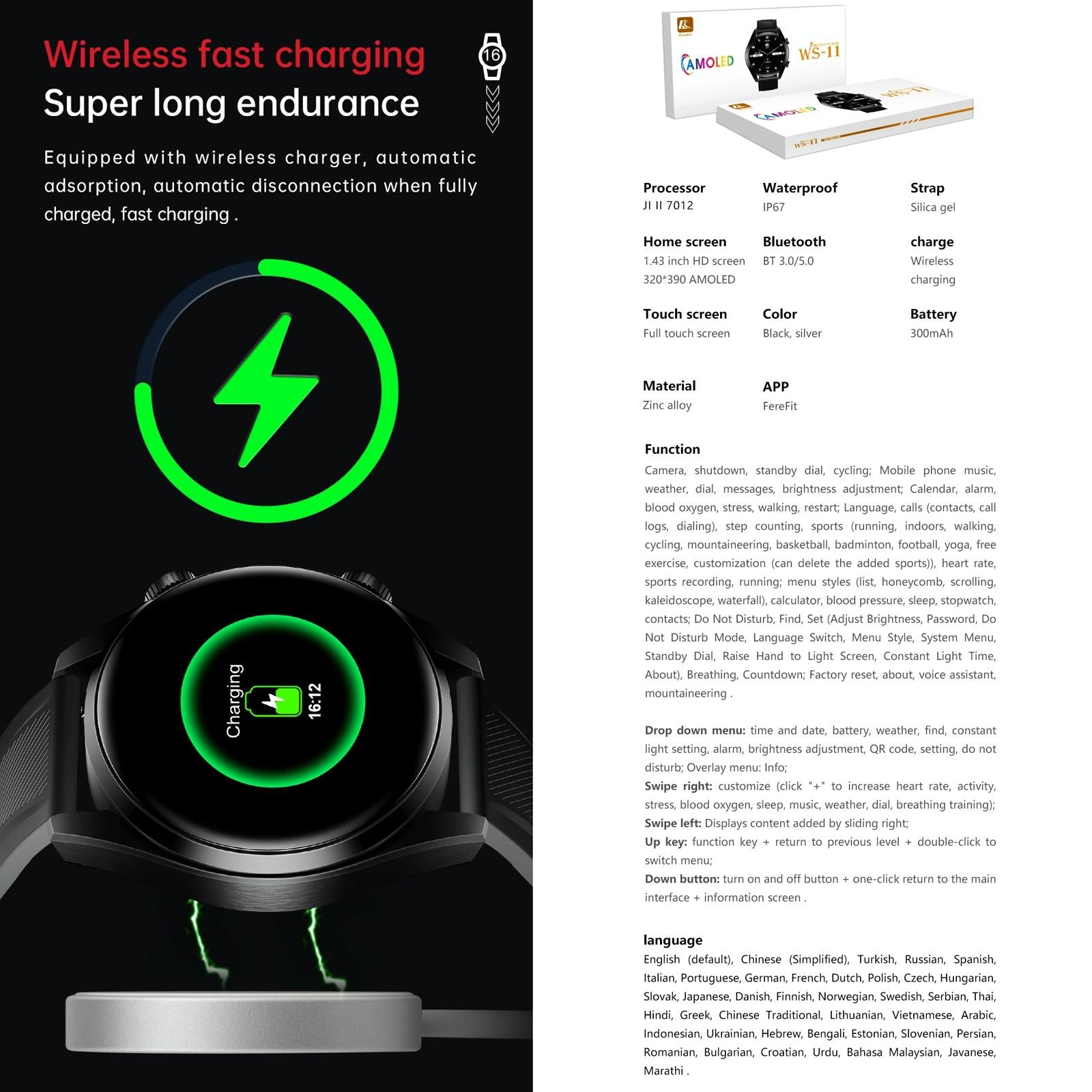• Wireless charging with a 300mAh lithium polymer battery