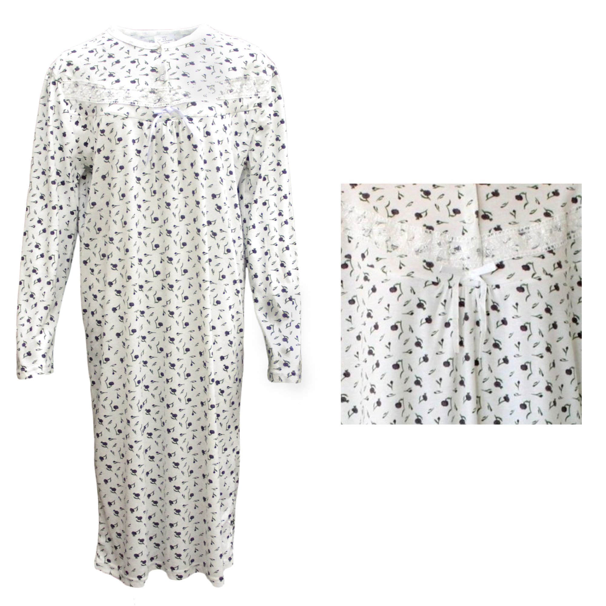 100% Cotton Women Nightie Night Gown Pajamas Pyjamas Winter Sleepwear PJs Dress, Purple Flowers, 12