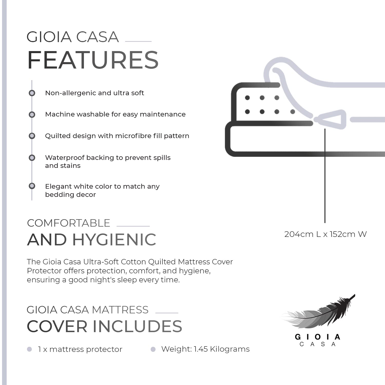 • Comfortable and Hygienic: Invest in comfort and protection with the Gioia Casa Ultra-Soft Cotton Quilted Mattress Cover Protector. This essential bedding item not only prolongs the life of your mattress but also provides the peace of mind you need for a restful nights sleep.