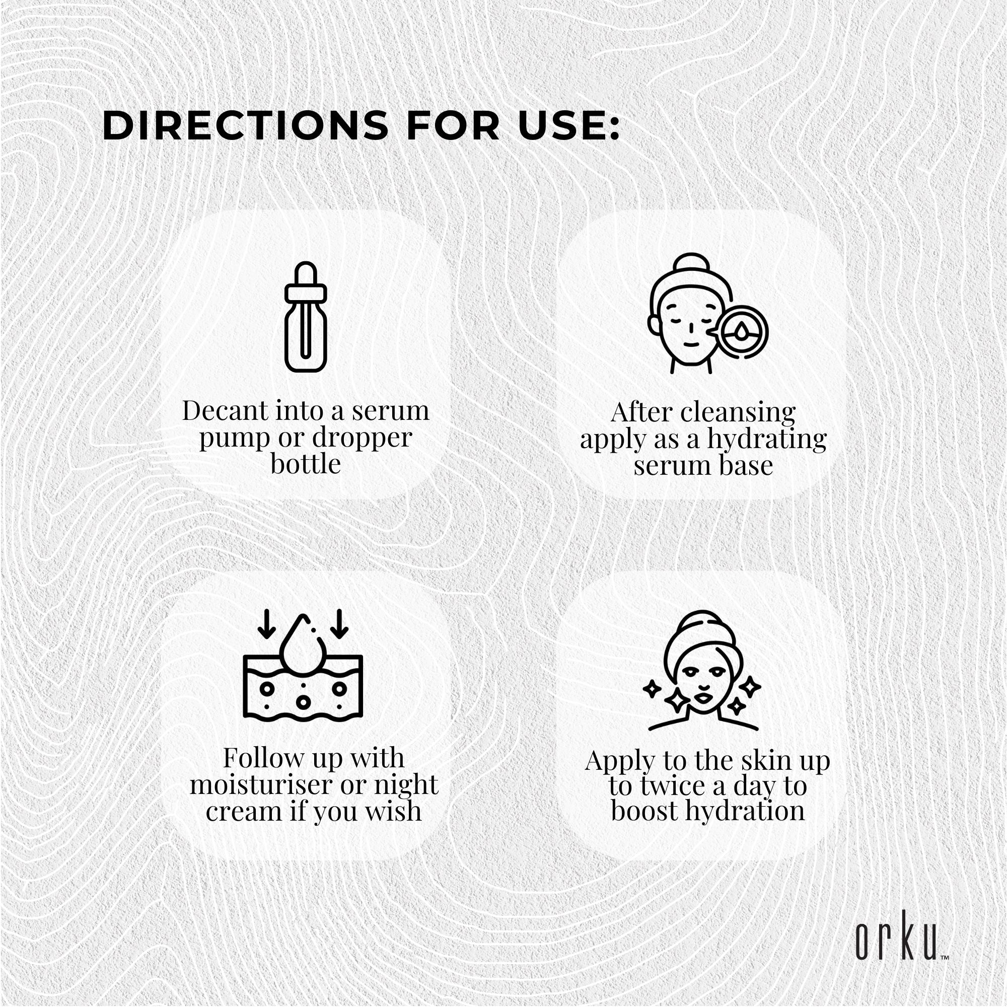 Directions For Use:Â Decant into a serum pump or dropper bottle and use after cleansing as a hydrating serum base. You can then follow up with moisturiser or night cream if you wish.