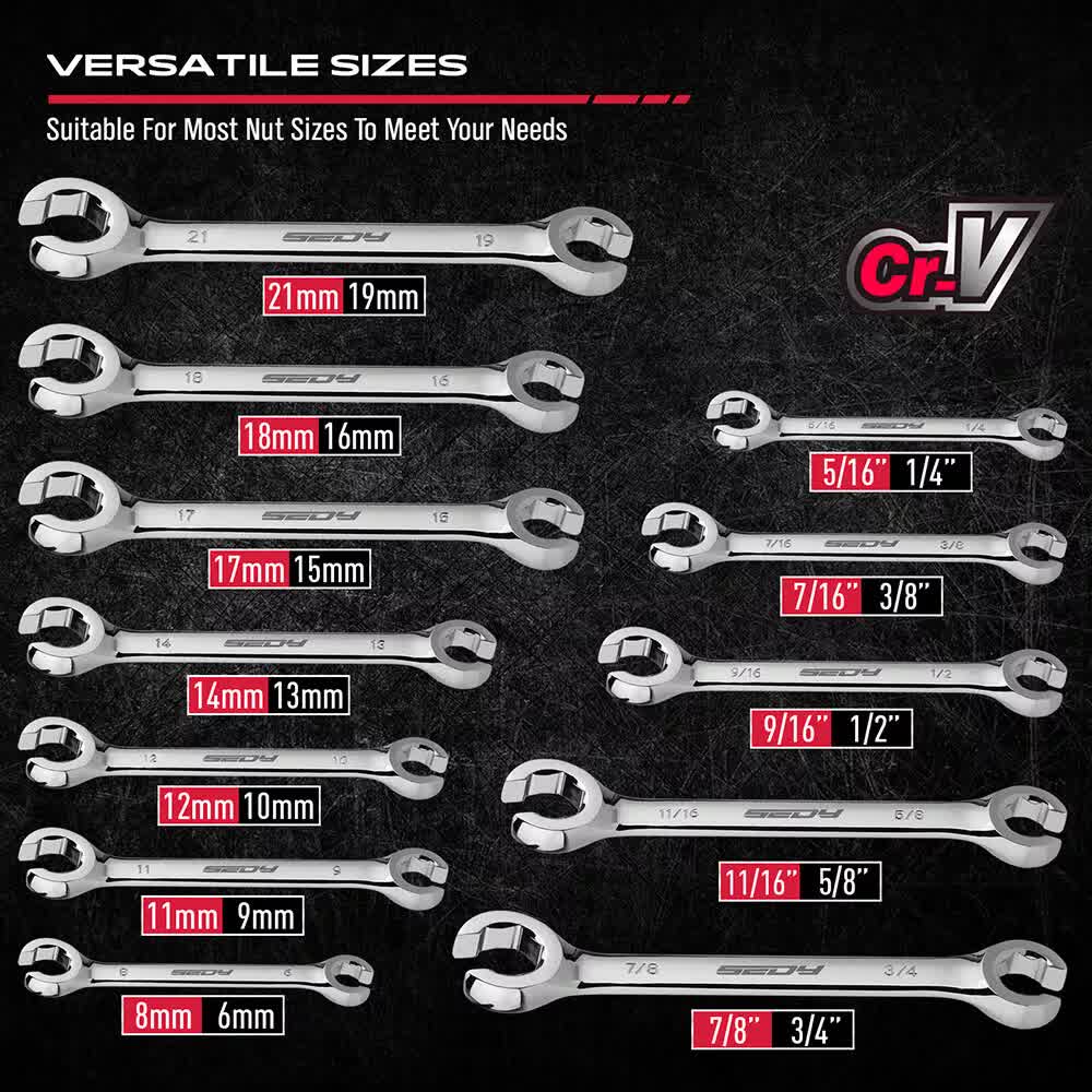 VERSATILE SIZES This practical set includes 12 pieces with both SAE and Metric sizes, covering the most common sizes for automotive and plumbing repairs. With wrench sizes ranging from 1/4″ to 7/8″ and 9mm to 21mm, it provides everything you need for brake line repairs and nut removal with precision.