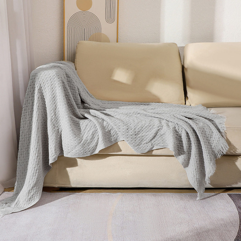 130*230CM Grey Nordic Solid Color Knitted Sofa Throw Blanket with Tassels – Waffle Weave Polyester Decorative Blanket
