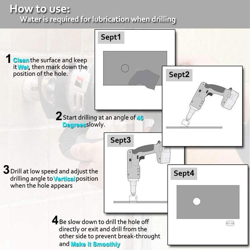 – Diamond Drill Bits Start the hole diagonally, make a round weave and then hold the drill straight. Water is required for lubrication during drilling.