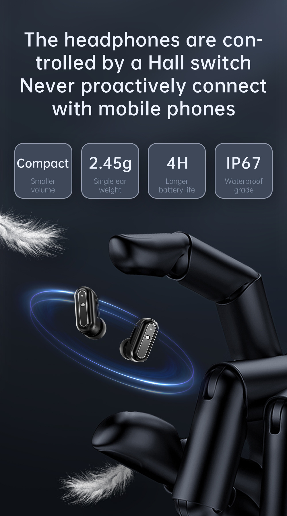 - Integrated TWS Earphones: Compact (2.45g each), IP67 waterproof, Hall switch control, offering up to 4 hours of playtime.
