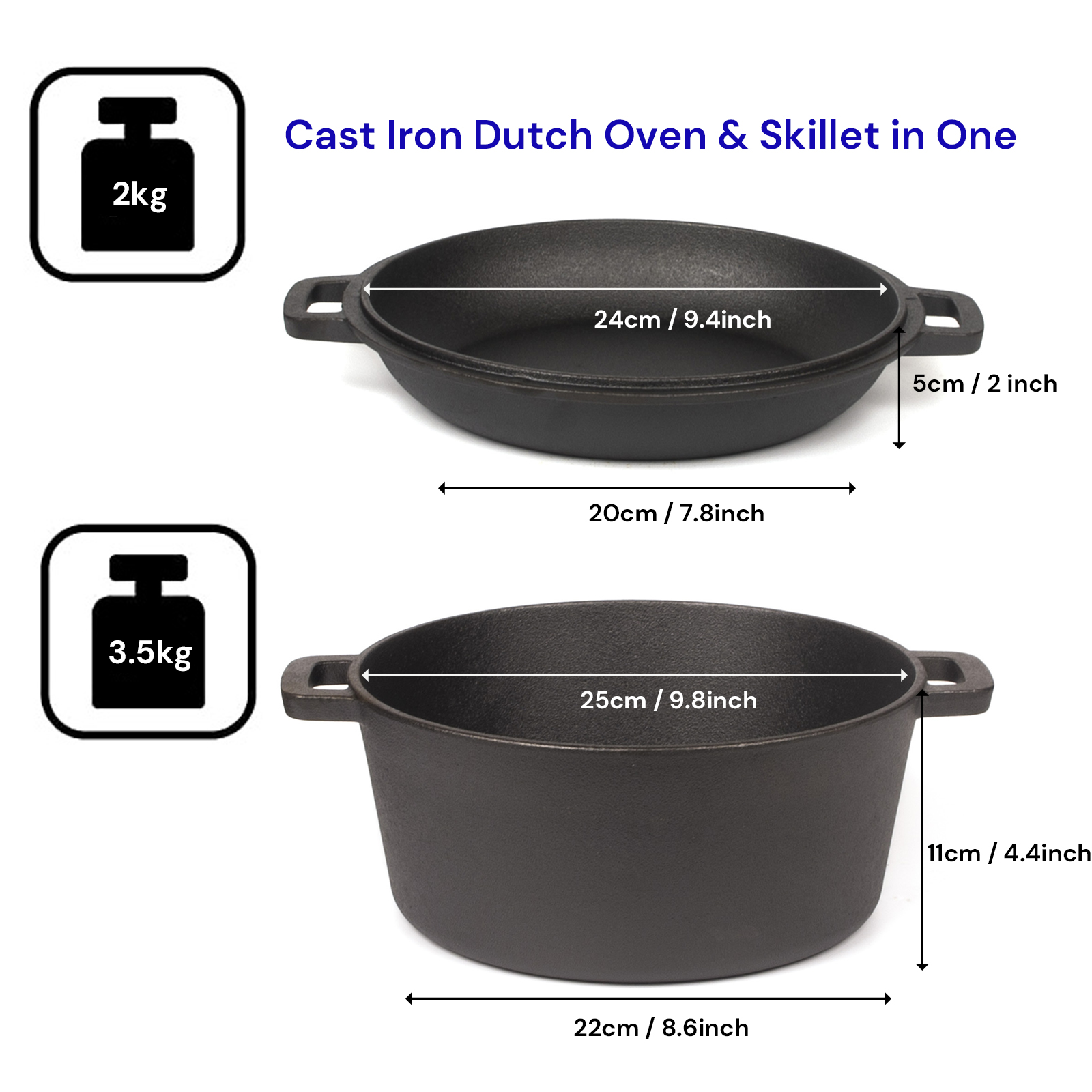 Cook like a pro with this heavy-duty 2-in-1 Cast Iron Dutch Oven and Skillet Set perfect for stews, roasts, frying, and baking.