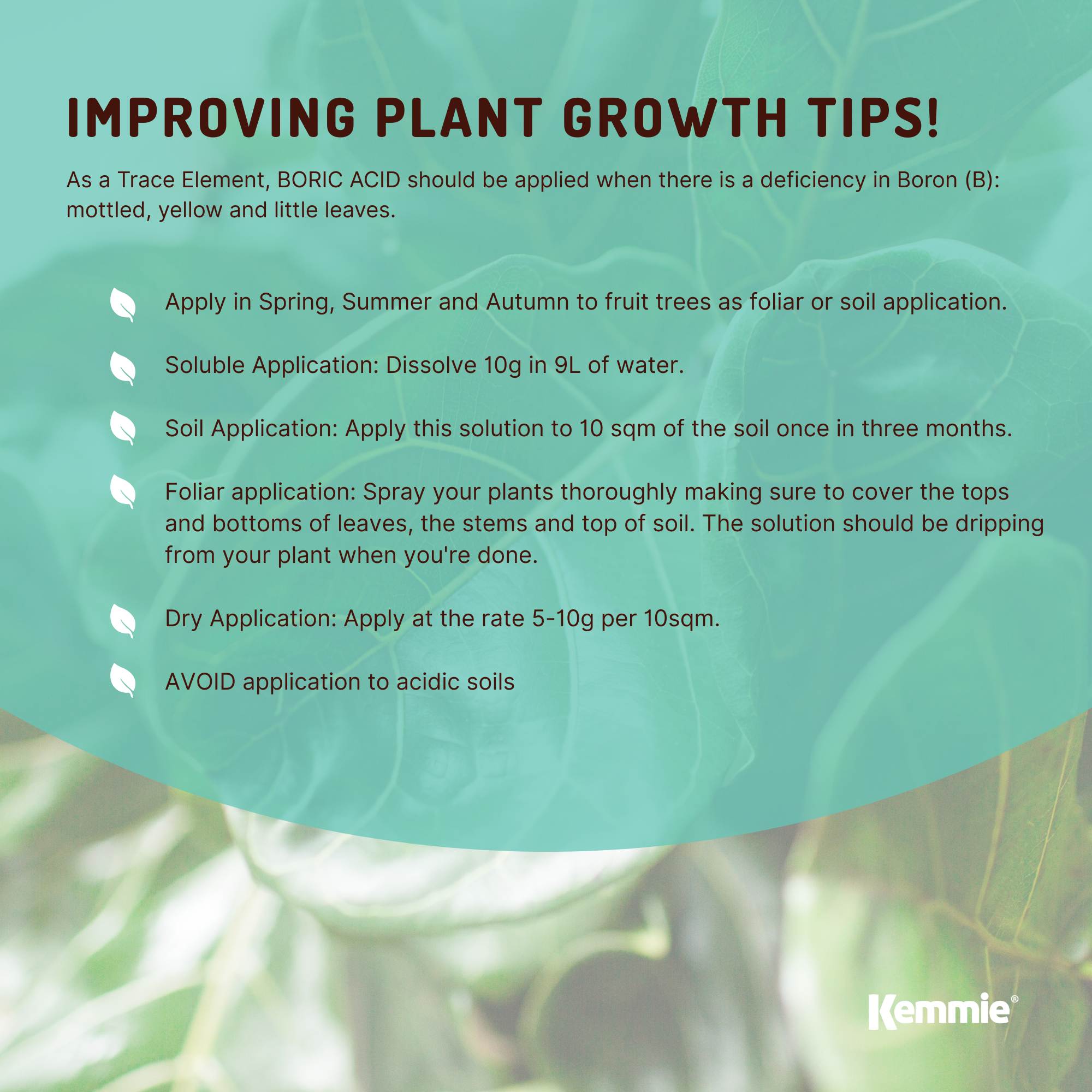 - Apply in Spring, Summer and Autumn to fruit trees as foliar or soil application.