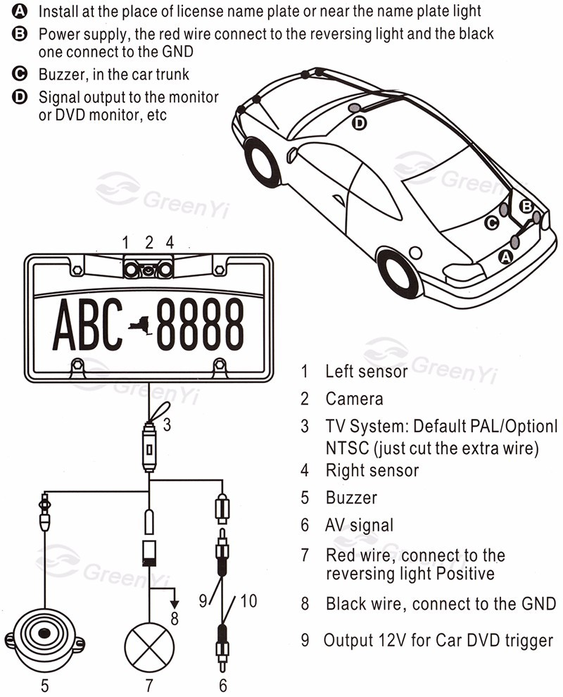 • Power Supply: Connects to vehicle’s reversing light (12V)