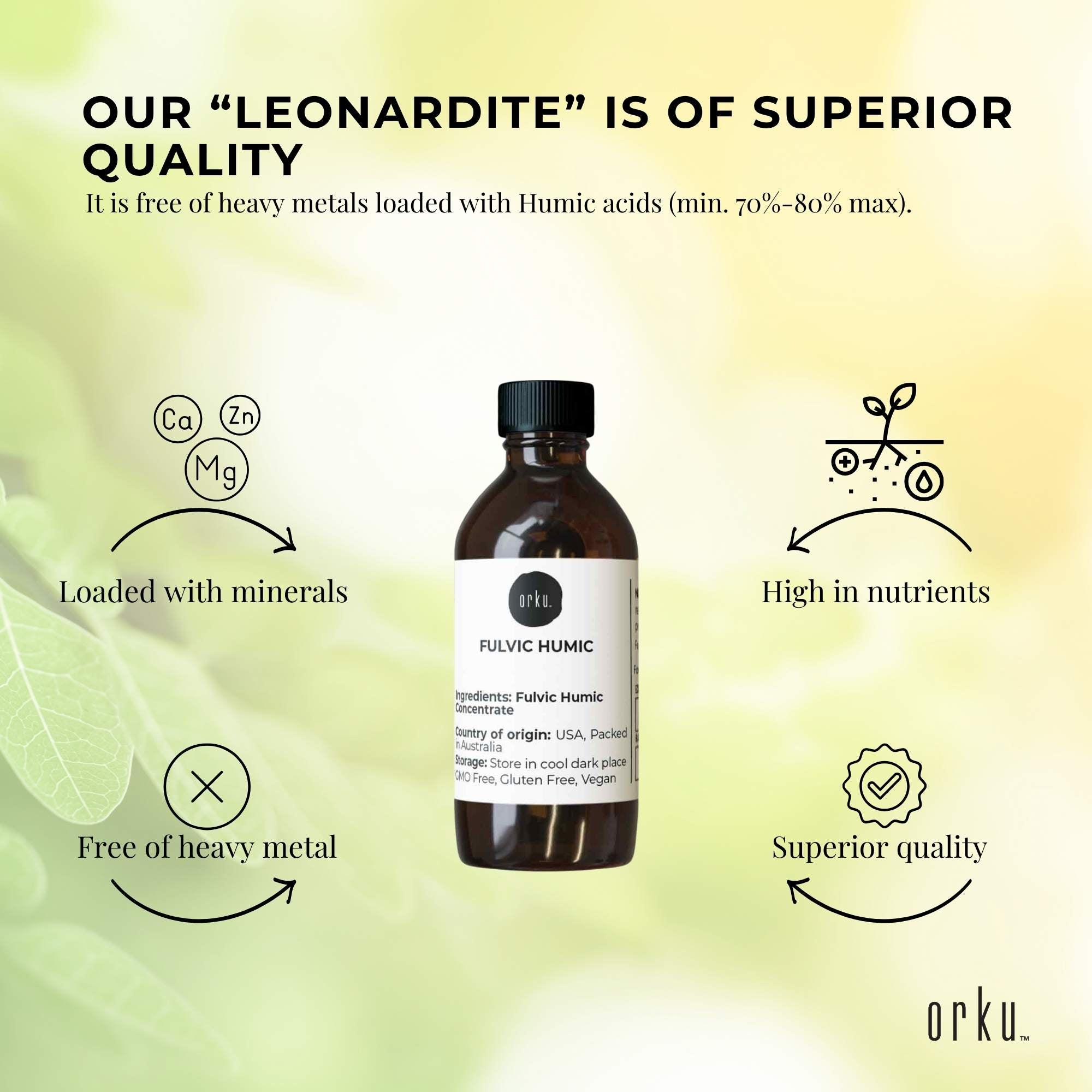 Humic substances are broken down into humic acid, and fulvic acids. The Fulvic fraction/component in our Organic Leonardite is approx 30%, perhaps the highest available in the world. Research into humic and fulvic acids have found them to be very beneficial, if not vital for human health, animal health and the health of the soils that grow the pastures for animals and or horticultural/agricultural crops hence the food we eat.