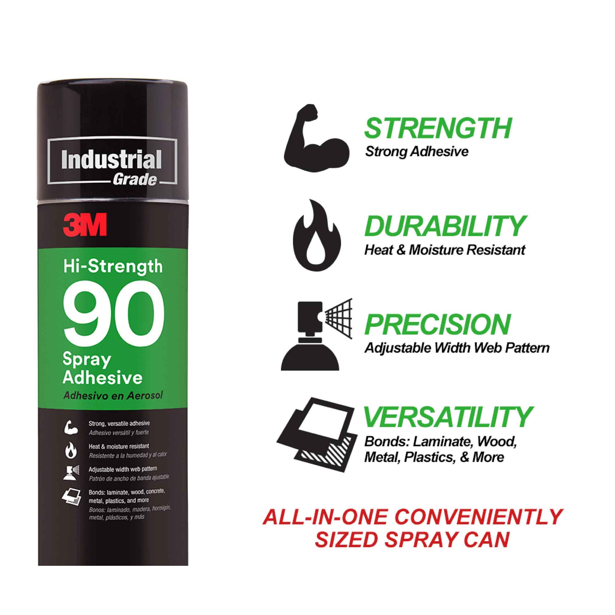 3M Hi-Strength 90 Spray Adhesive is our fast-drying, transparent spray adhesive that bonds on concrete, wood, MDF, laminates, polyethylene and more. Its extremely strong bond gives you fast results to keep projects moving forward. This industrial grade formula is easy to dispense and apply directly to surfaces and materials and provides the added benefit of high heat and moisture resistance.
