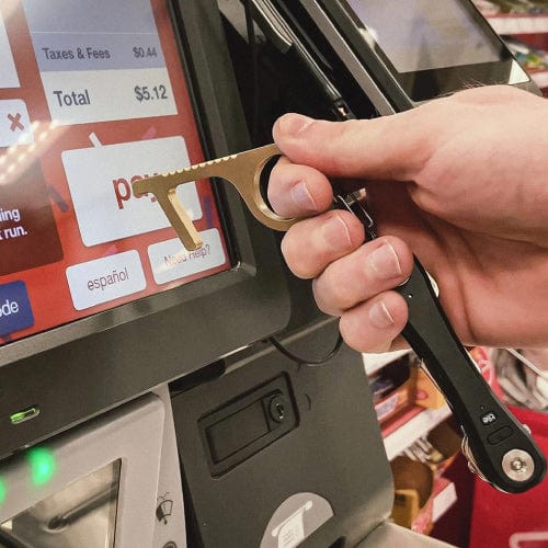 Avoid touching public touchscreens like store checkouts. The ergonomic design makes it easy to open doors, press buttons pull levers. Antimicrobial 260 Brass Alloy kills germs in up to 4 hours. Reduce point-of-contact area by over 99%