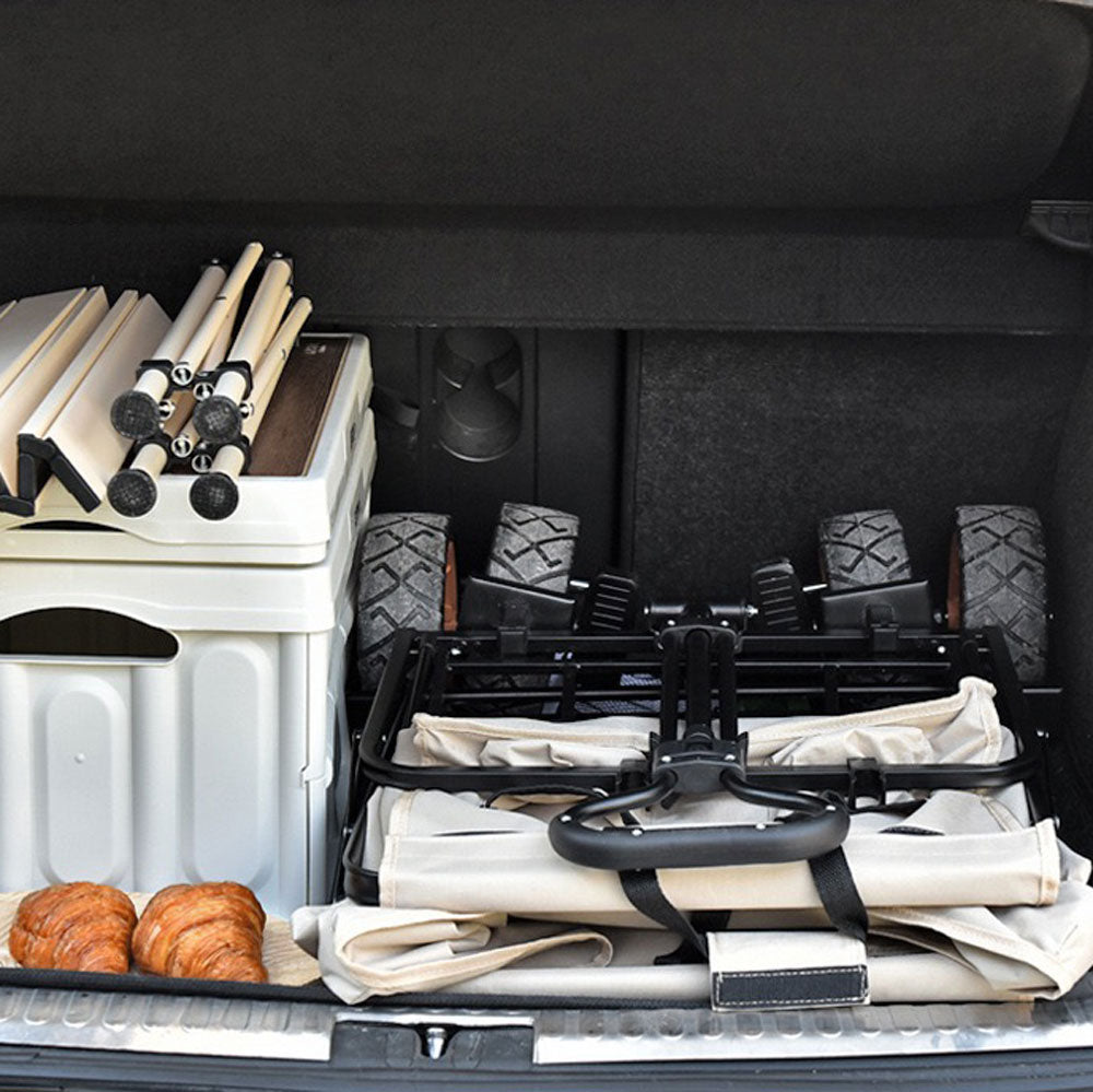 Easy to Fold Store: All terrain collapsible folding outdoor wagon cart has internal pull rope design, it can be folded in seconds. No need to install, easy to operate and transport. With a compact design this thing folds into a mini size that you can simply fold it with one hand. It is convenient to be stored at home, garage and car boot, and we also offer a carry-on bag for carrying and storing. SpaceLabor Saving.