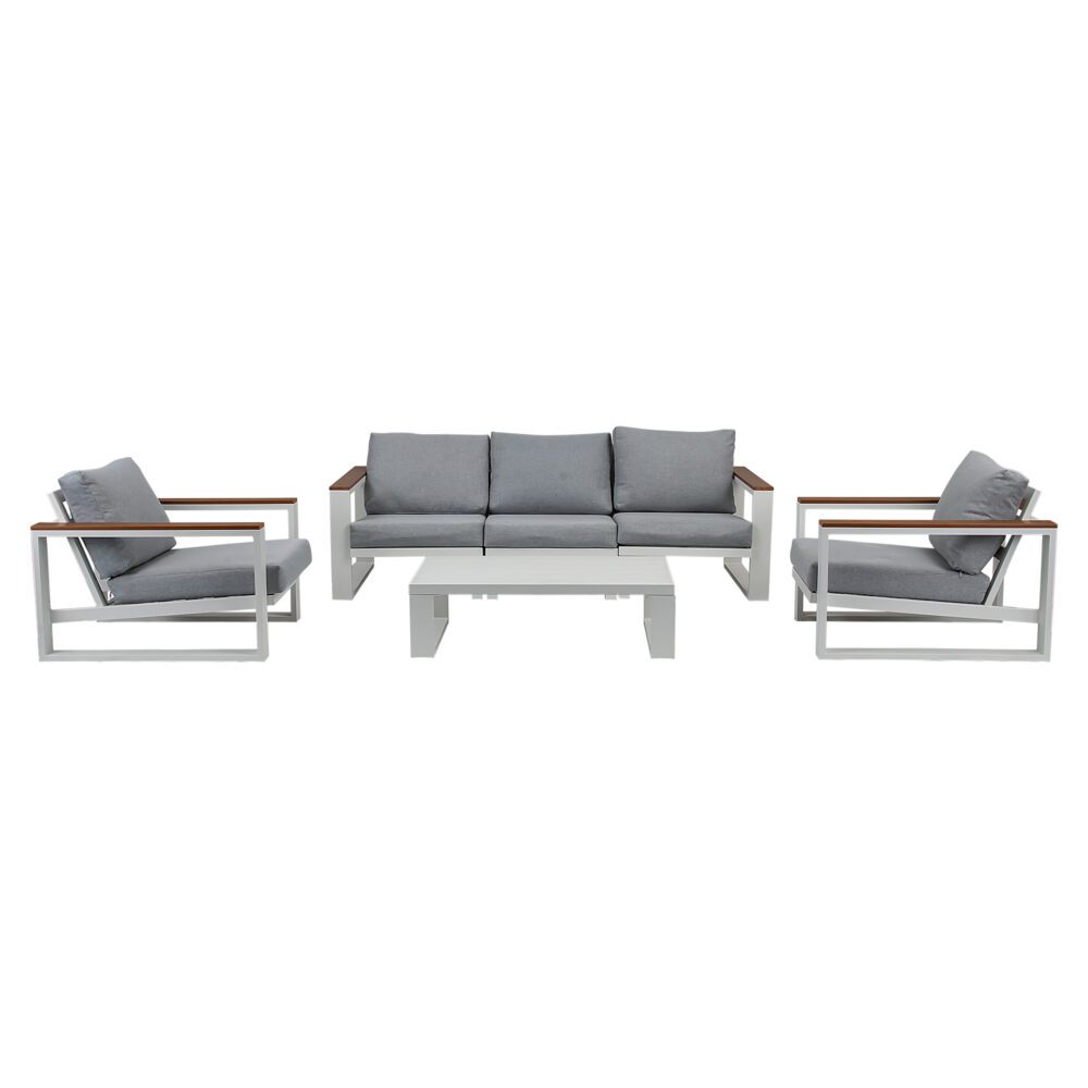 Aluminum slat top coffee table offer a place to set your coffee, snacks and books. Spacious seating can have a chat with your friends sitting on this sofa set.