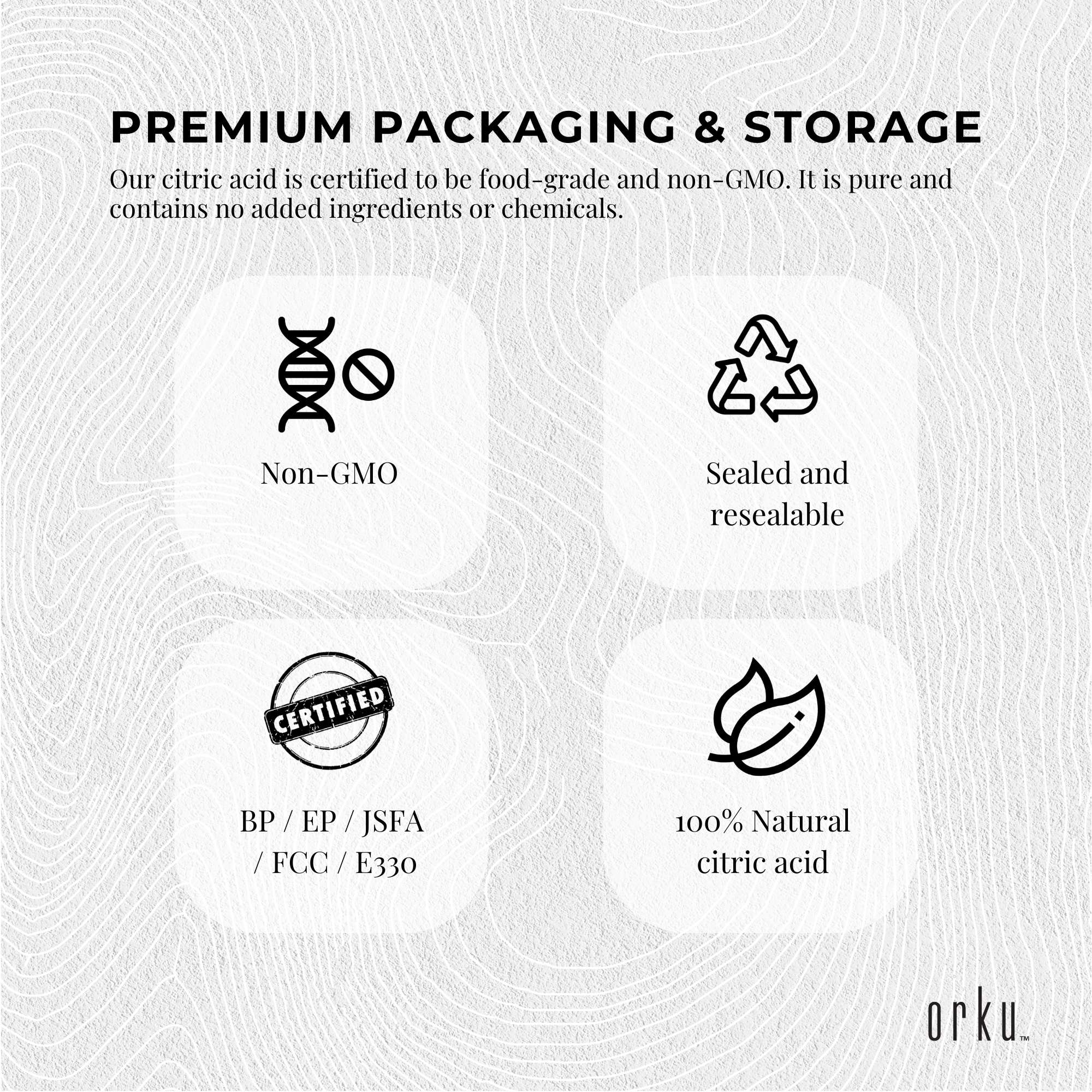 Our Citric Acid is fully compliant Food Grade GMO Free Certified BP / EP / JSFA / FCC / E330. Packages come in quality sealed and resealable bags.