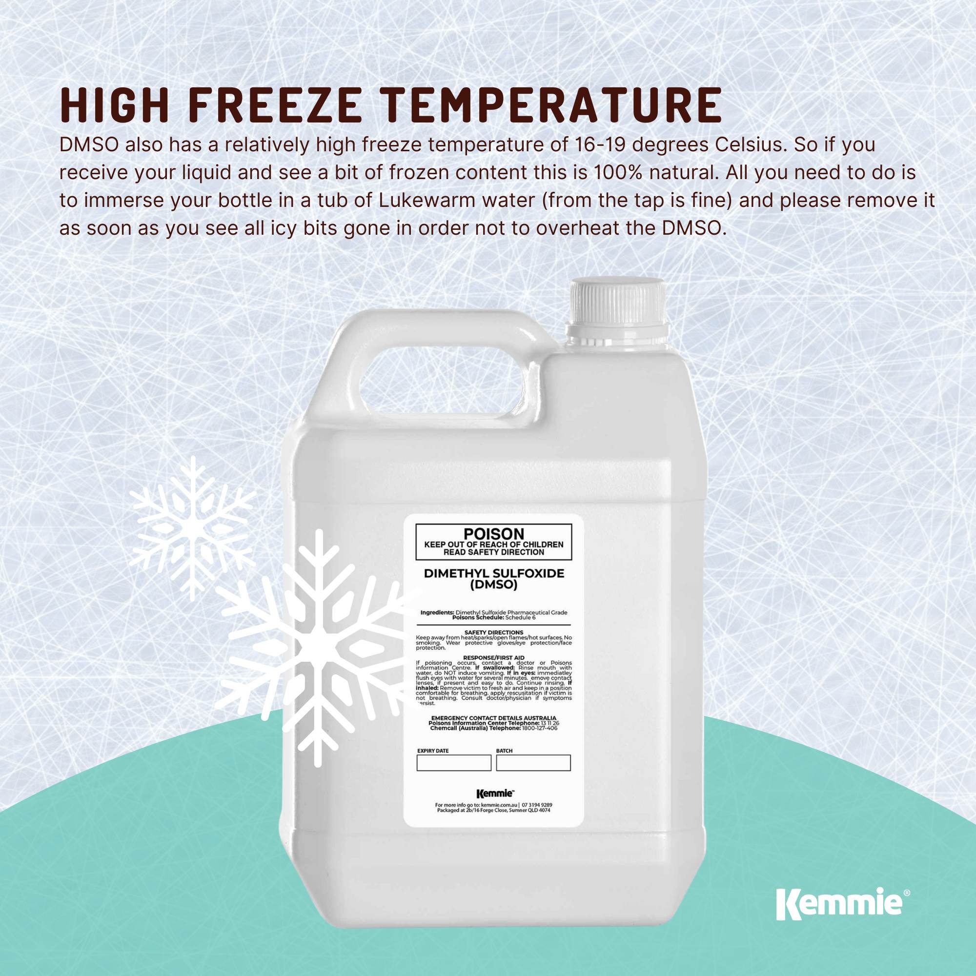 DMSO also has a relatively high freeze temperature of 16-19 degrees Celsius. So if you receive your liquid and see a bit of frozen content this is 100% natural. All you need to do is to immerse your bottle in a tub of Lukewarm water (from the tap is fine) and please remove it as soon as you see all icy bits gone in order not to overheat the DMSO.