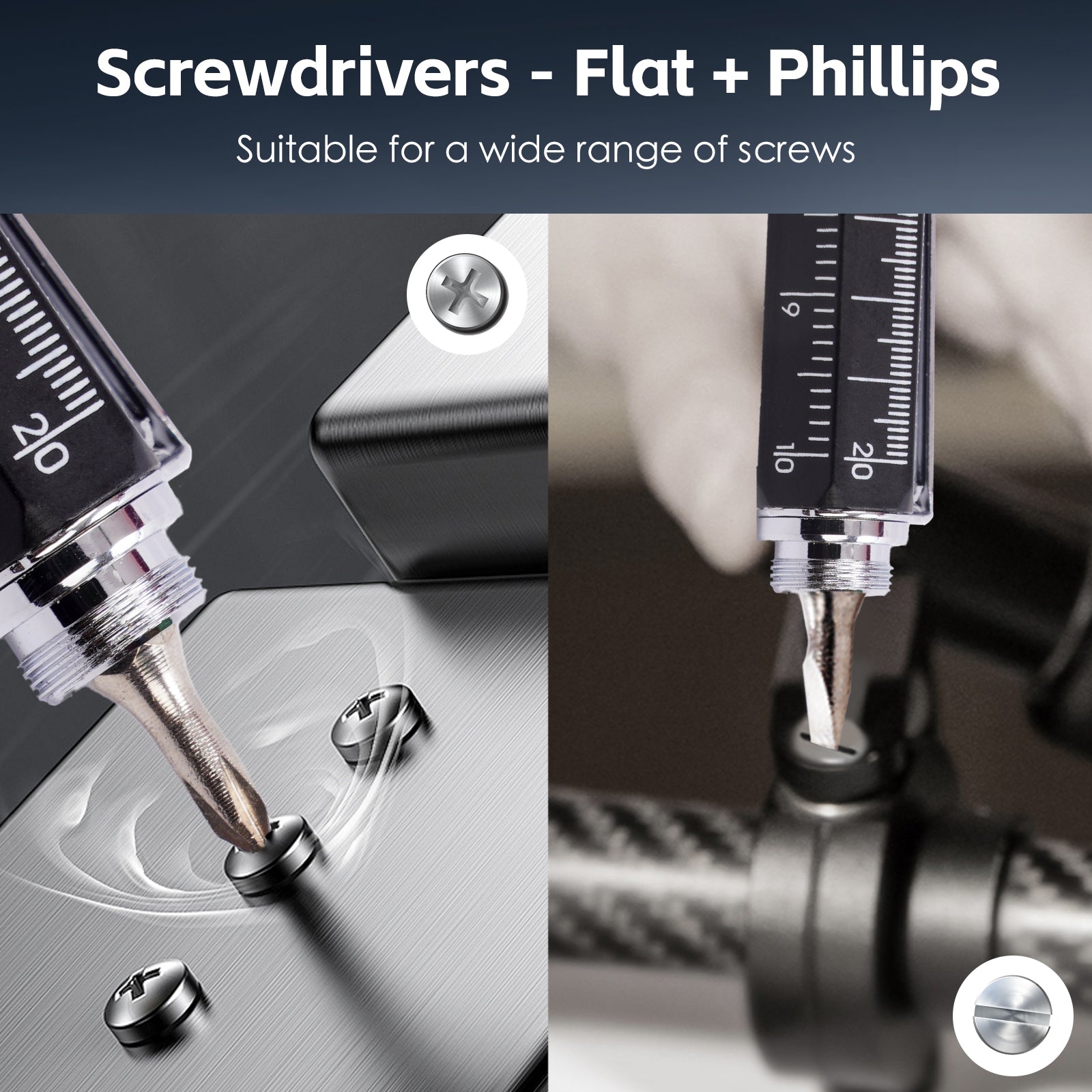 “All-in-One Versatility – This sleek pen combines six essential tools in one: a smooth ballpoint pen, a multi-scale ruler (4 measurements), a bubble level, a touchscreen stylus (glove-compatible), and dual screwdrivers (Phillips & flathead). Perfect for professionals and DIY enthusiasts alike!