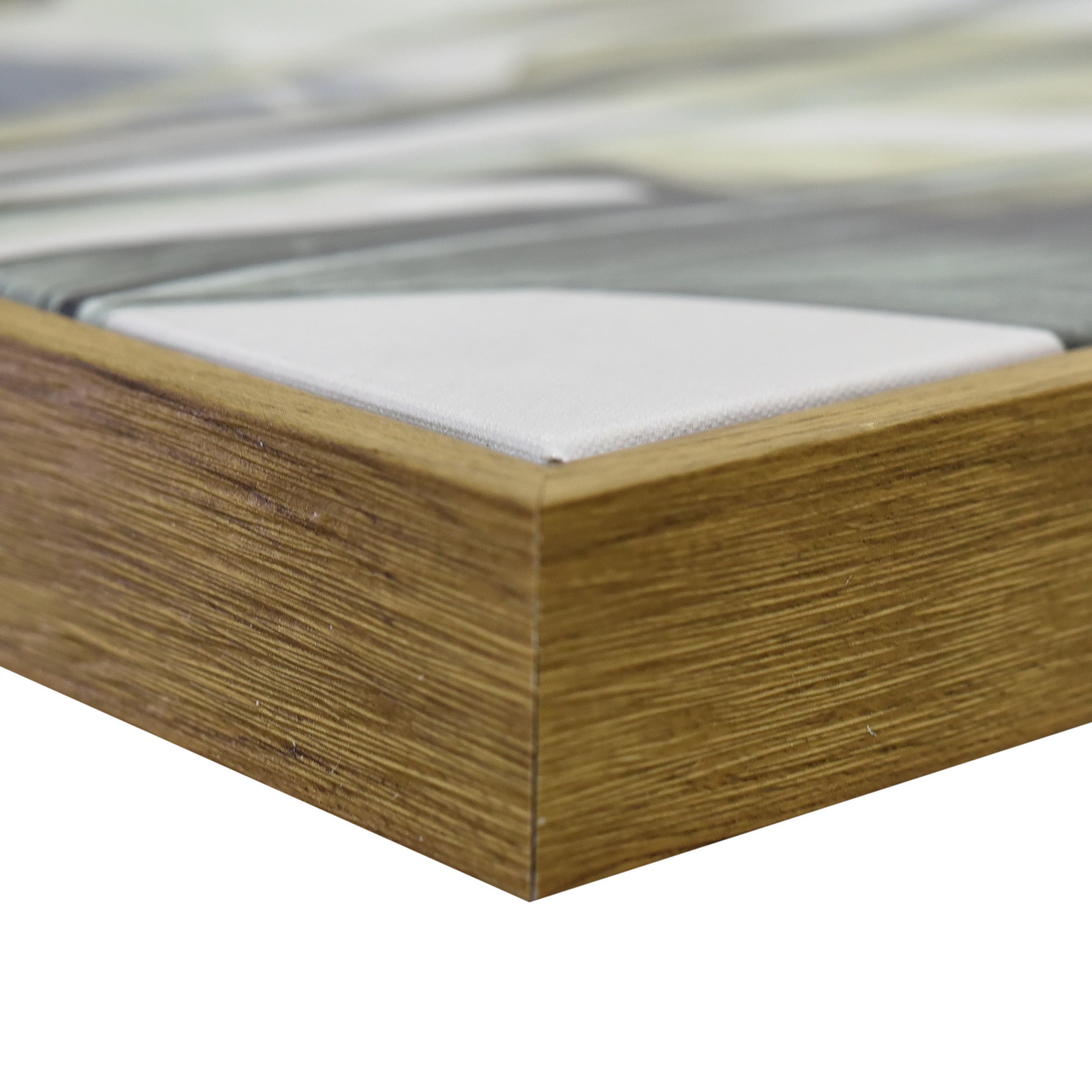 Stretched and gallery wrapped around a wooden stretcher and finished with a floating frame. There is a gap between the frame and print, which creates the floating effect and literally makes the canvas print stand out even more.