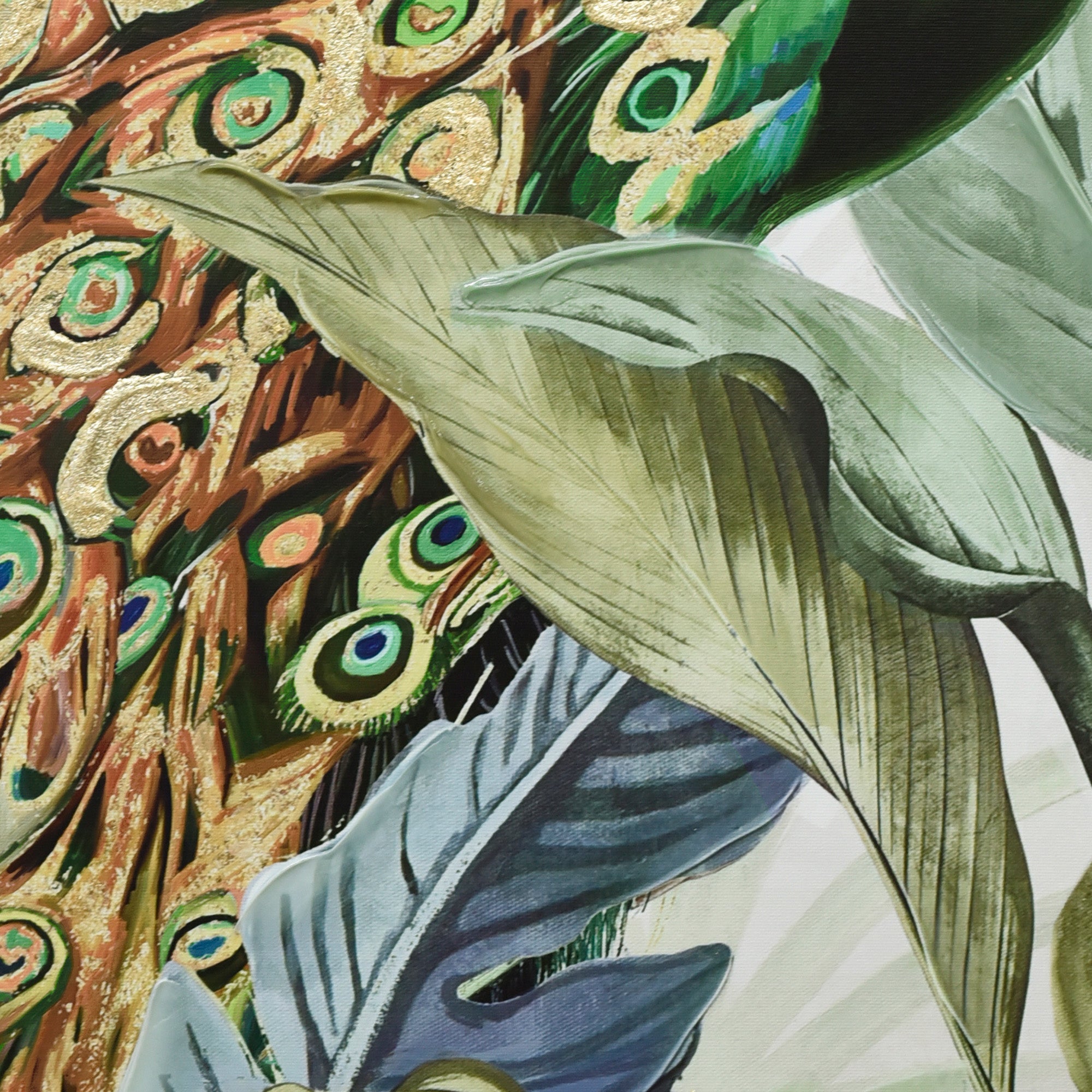 “Golden Plume” is a vibrant celebration of nature’s beauty and artistry. At its heart lies a magnificent peacock, its vibrant hues and intricate patterns capturing the essence of this regal bird. Surrounded by abstract florals and leaves, the peacock stands as a beacon of elegance and grandeur. What truly elevates this piece is the meticulous gold accentuation, especially on the peacock’s feathers, adding a touch of opulence and making the bird shimmer with every play of light. The artwork is a harmonious blend of hand-painted elements and print, ensuring that every detail is accentuated. Encased in a dark wood frame, “Golden Plume” beckons viewers to delve into the intricacies of the design and appreciate the mesmerizing dance of colors and patterns.