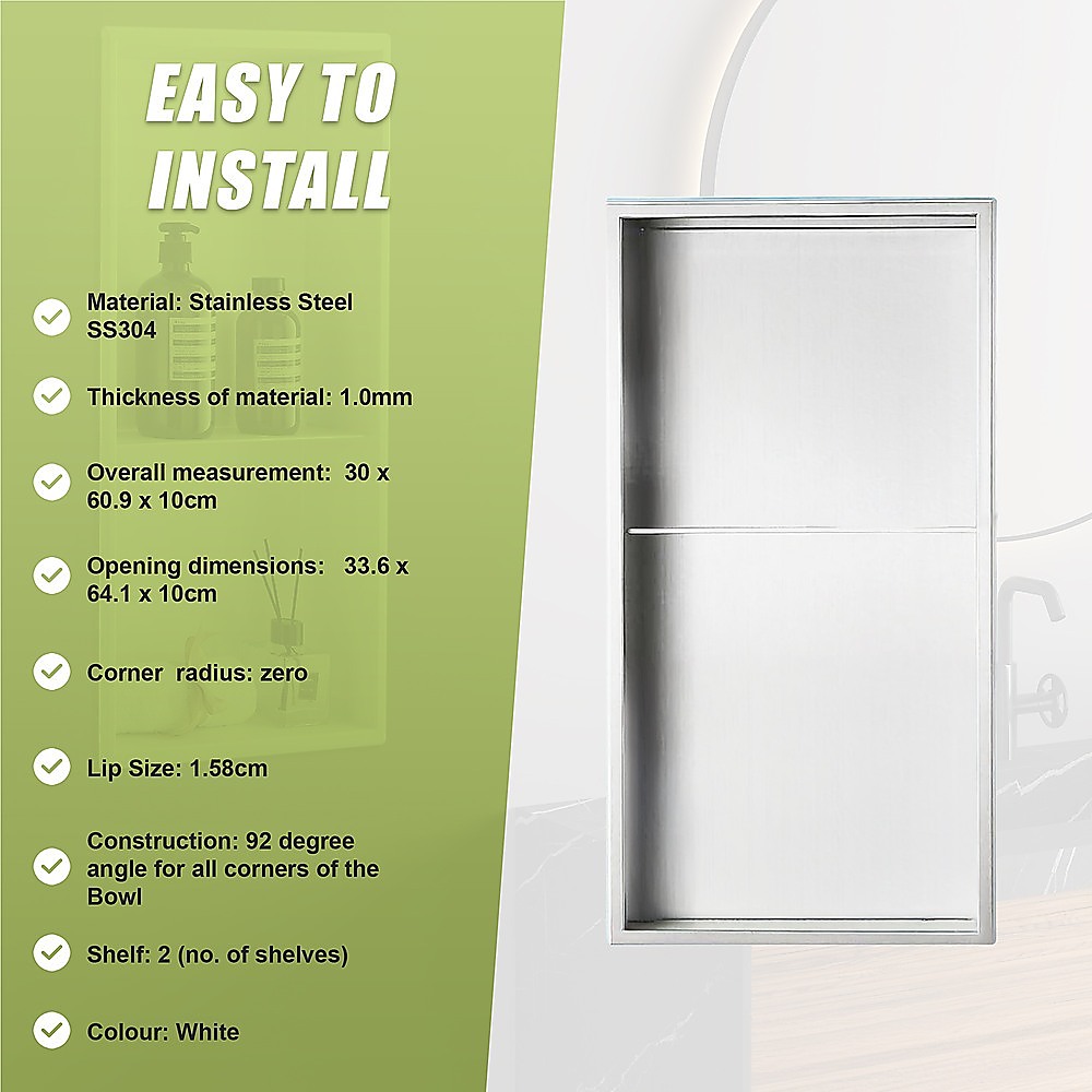 Transform your space into a modern oasis with this elegant and functional niche. Featuring two shelves, it provides the perfect storage solution for all your bathroom essentials and small shower products. Enjoy the seamless blend of stylish design and practical convenience.