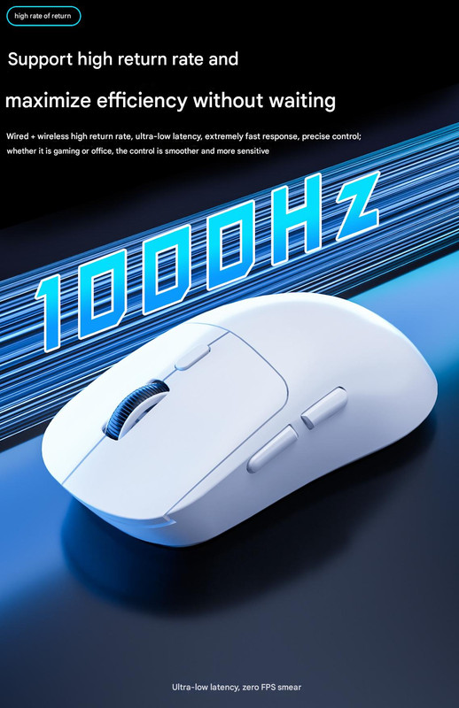 The 1000Hz polling rate ensures ultra-low latency and precise control, providing an exceptionally responsive gaming or work experience. Enjoy the convenience of triple mode connectivity (Wireless, Bluetooth, Wired Type-C), allowing for easy switching between devices and setups. A 500mAh high-capacity battery eliminates frequent charging, while the nano ice-skin coating provides a comfortable, non-sweaty grip for extended use.