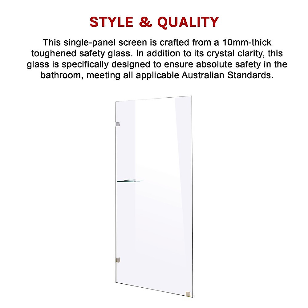 This single-panel screen is crafted from a 10mm-thick toughened safety glass. In addition to its crystal clarity, this glass is specifically designed to ensure absolute safety in the bathroom, meeting all applicable Australian Standards. Three sturdy clips one for the floor, two for the wall are included for a straightforward, hassle-free installation. This panel measures 800mm wide by 2100mm high.