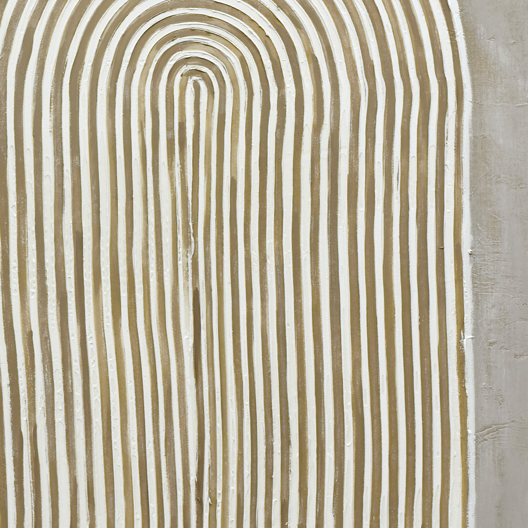 “Duality’s Embrace” is an art piece that speaks to the contrasts and harmonies present within life and nature. Measuring 80cm x 120cm, this hand-painted marvel showcases a tactile journey through its rich thick textures. A backdrop split meticulously down the middle captures the dichotomy of pure white and muted grey, symbolizing the balance of light and shadow in our lives. Against this stark canvas, a U-shaped line gracefully descends in the foreground, crafted from pristine white plaster juxtaposed with earthy brown paint. This design element resonates with themes of grounding and transcendence. Encased in a delicate light wood frame, “Duality’s Embrace” serves as a meditative reminder of the intricate dance between opposing forces and the beauty that emerges from their union.