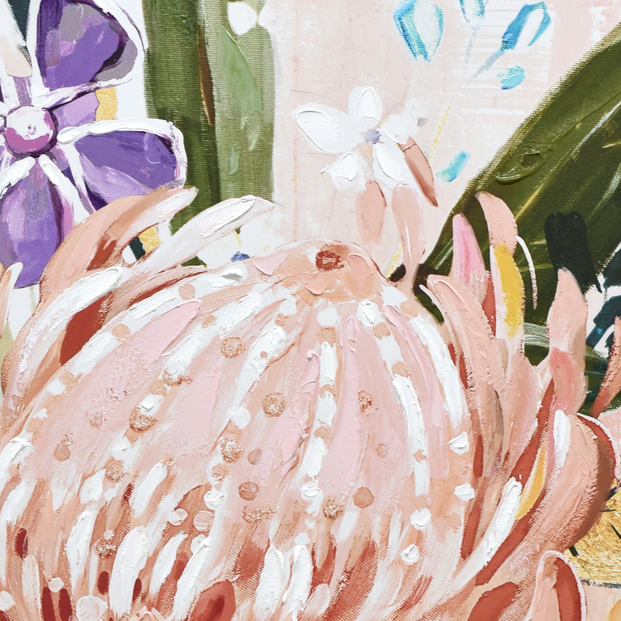 Step into a vibrant realm of nature with “Native Bloom,” a 80cm x 120cm artwork that celebrates the beauty and diversity of native flowers. Bursting with color, each bloom stands out, showcasing the rich palette of hues that only nature can offer. The meticulous blend of hand-painting and print brings out the intricate details of each petal, leaf, and stem, making the flowers come alive against the canvas. Encased in a sophisticated dark wood frame, this floral masterpiece is not just a visual treat—it’s a tribute to the timeless charm and allure of nature’s creations. Whether you’re a lover of botany or simply appreciate the beauty of colorful blooms, “Native Bloom” is sure to captivate and inspire.