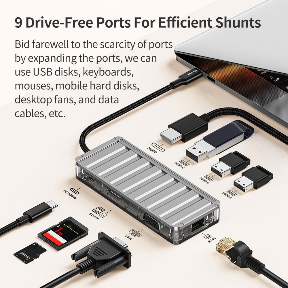 • 1 x 9-In-1 Multi-Function Type-C Hub Adapter Grey