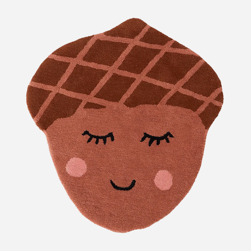 The gorgeous Acorn Floor Rug is a rich chestnut brown colour in two shades, with a serene, smiling face detailed in black with rosy, pink cheeks. The Acorn Rug is the perfect match to the new colourway.