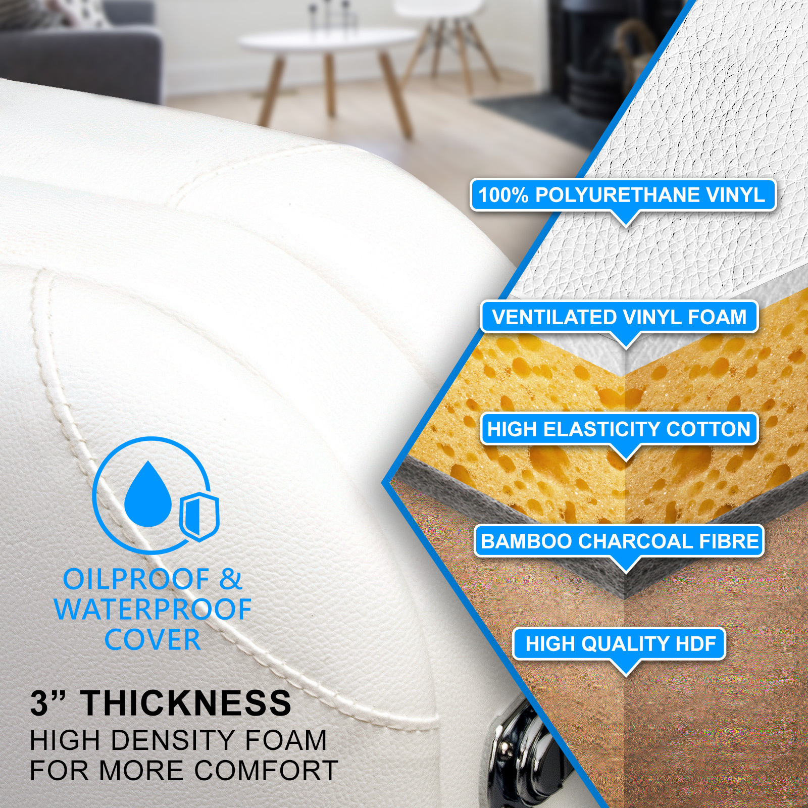 - Upholstered with high-quality PVC leather ensuring oil and waterproof and easy to clean