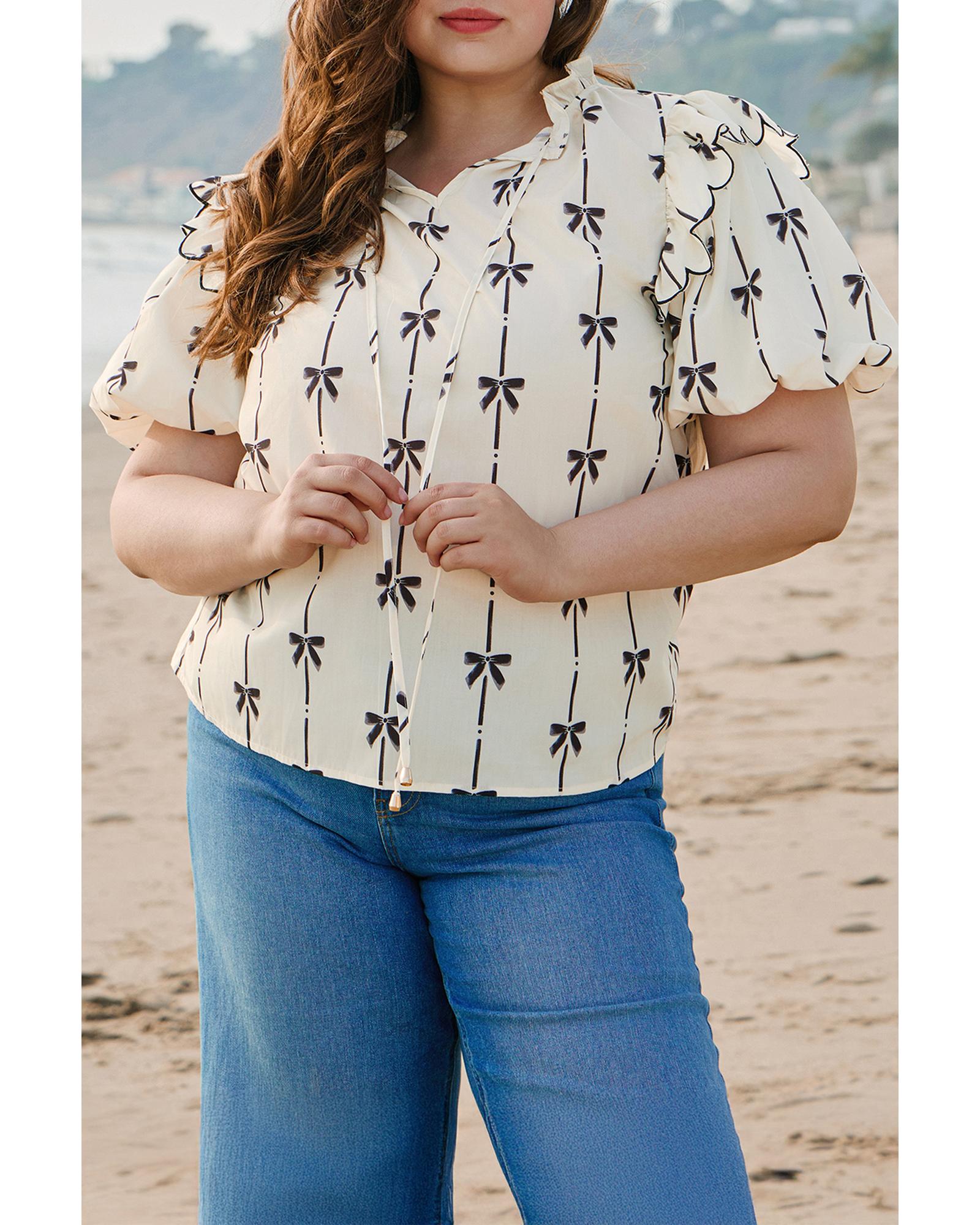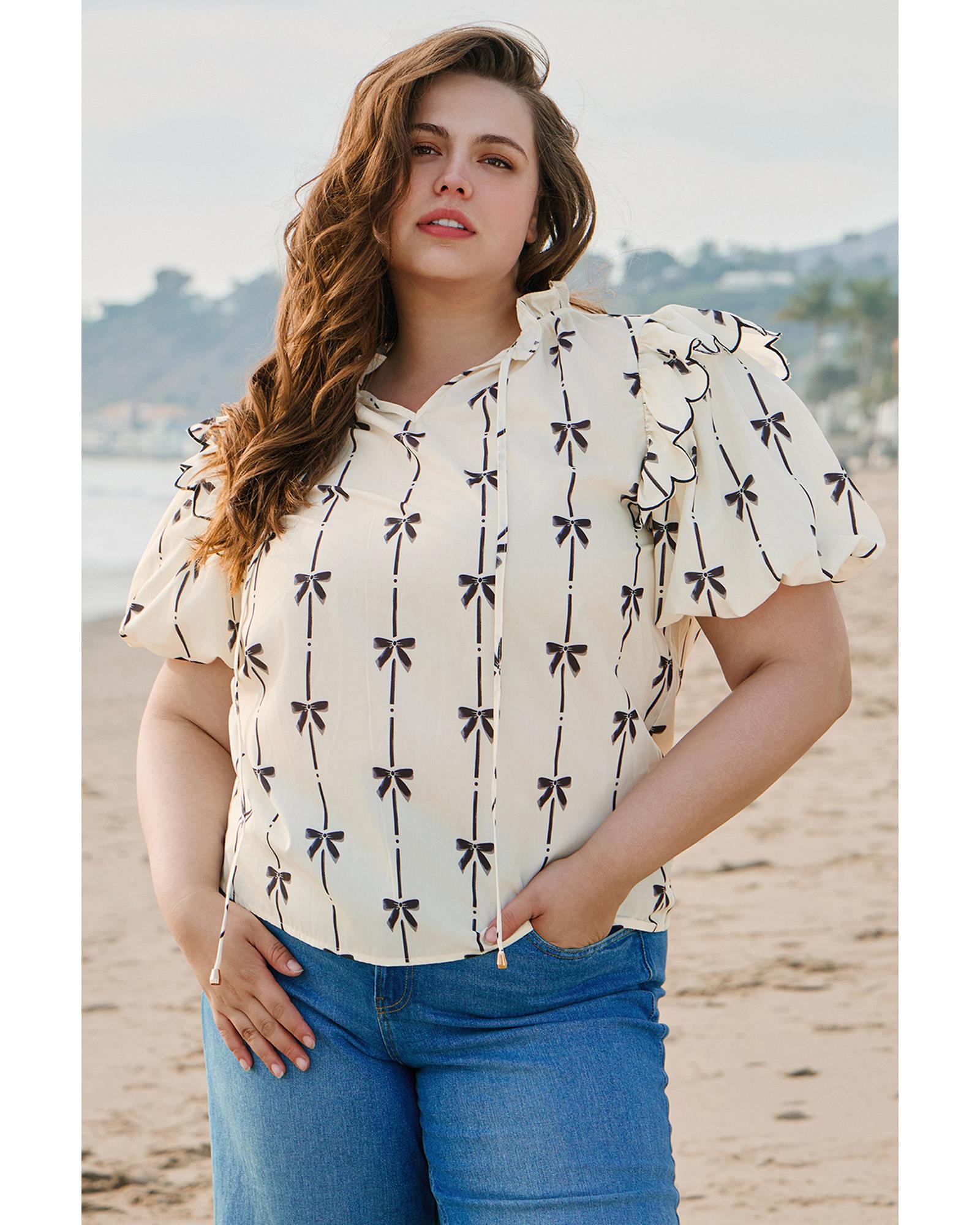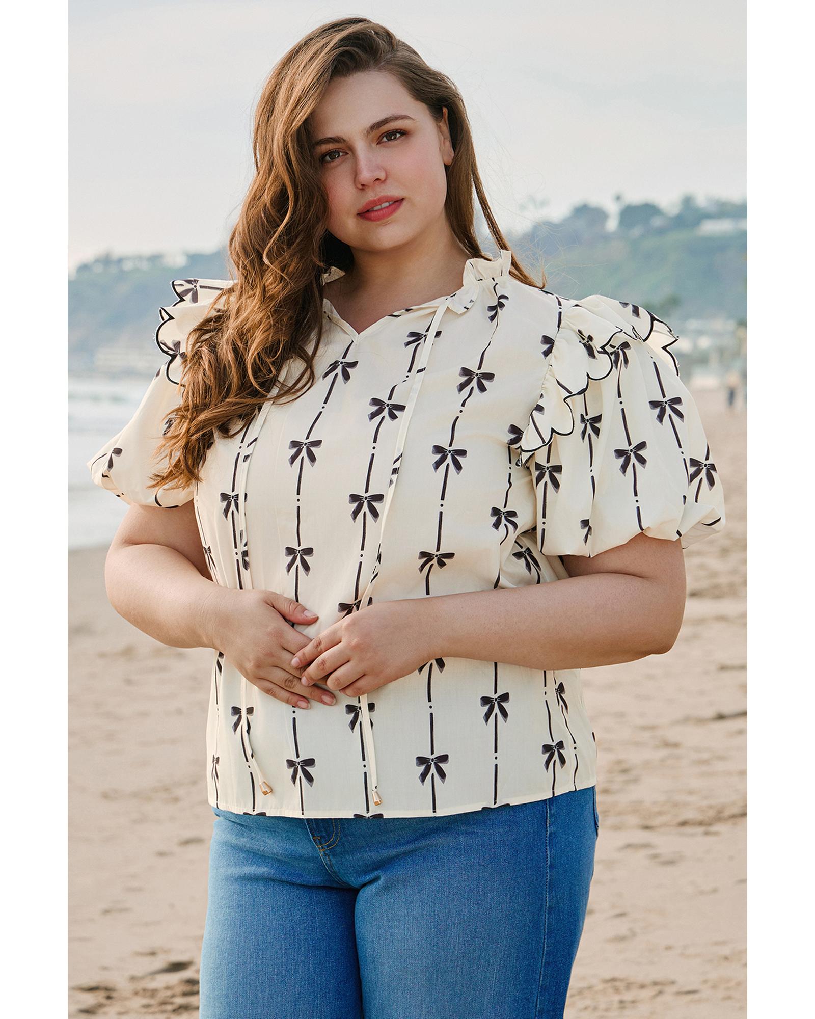 Apricot Bow Printed Ruffled Bubble Sleeve Lace-up Notched Neck Plus Size Blouse – 1X