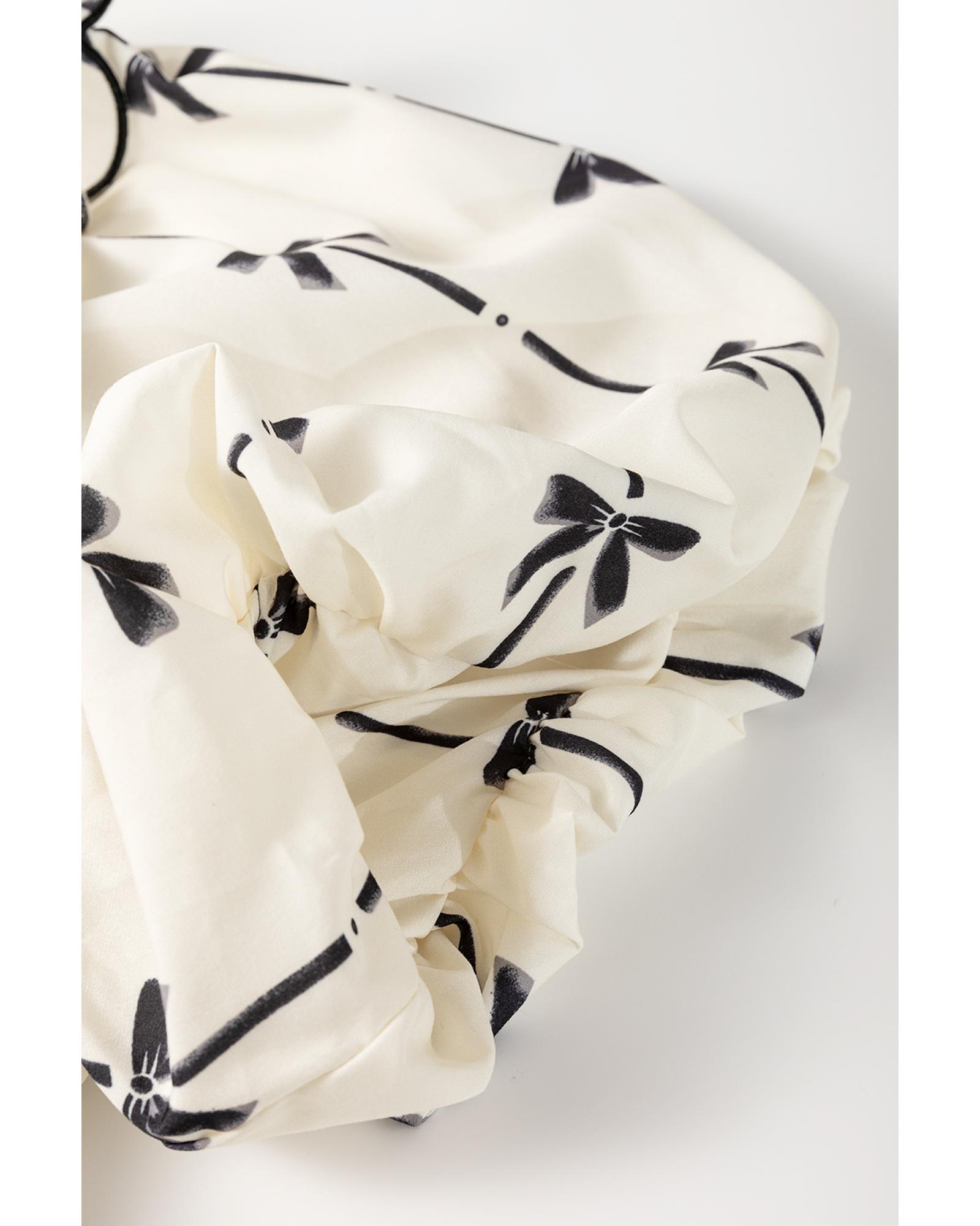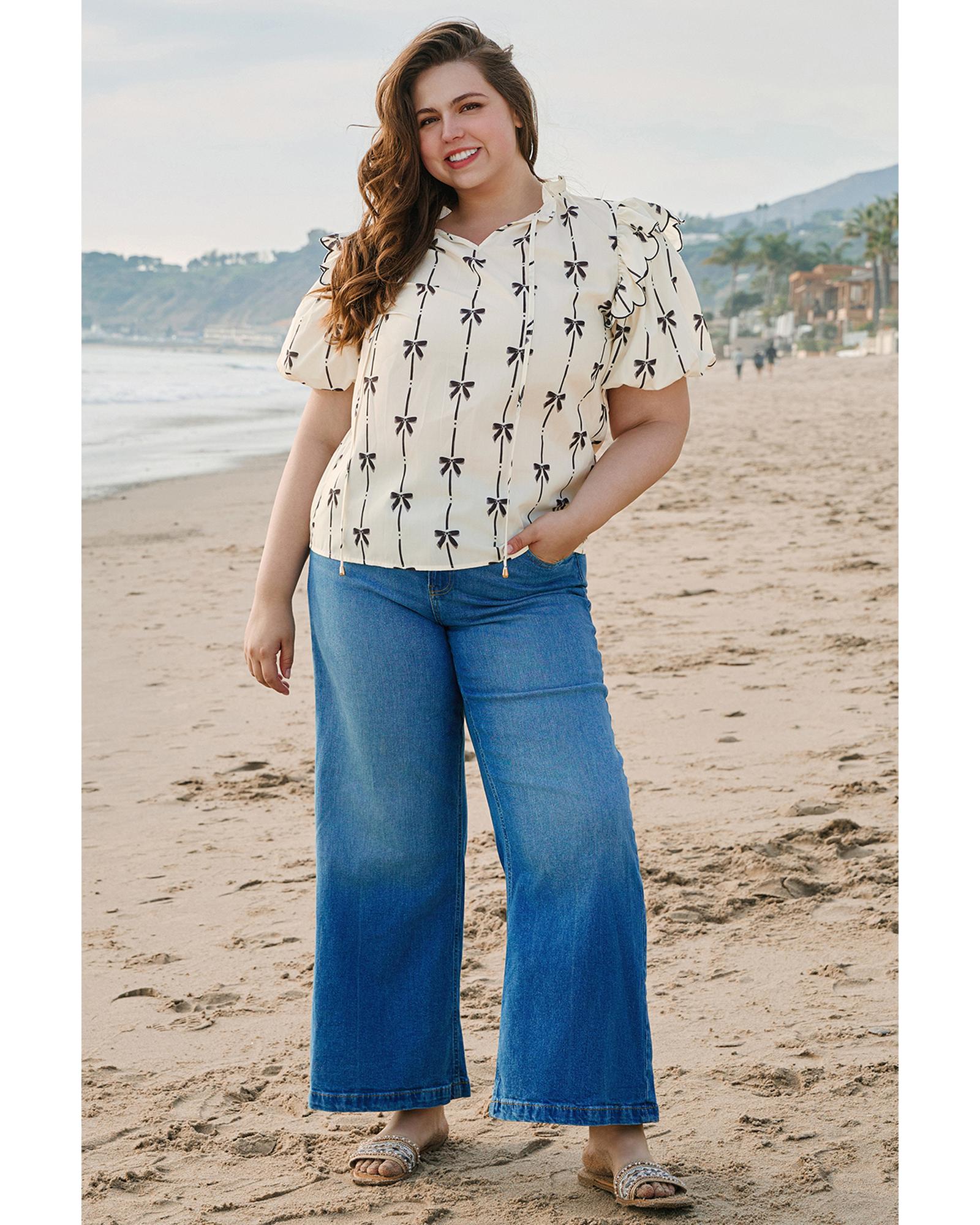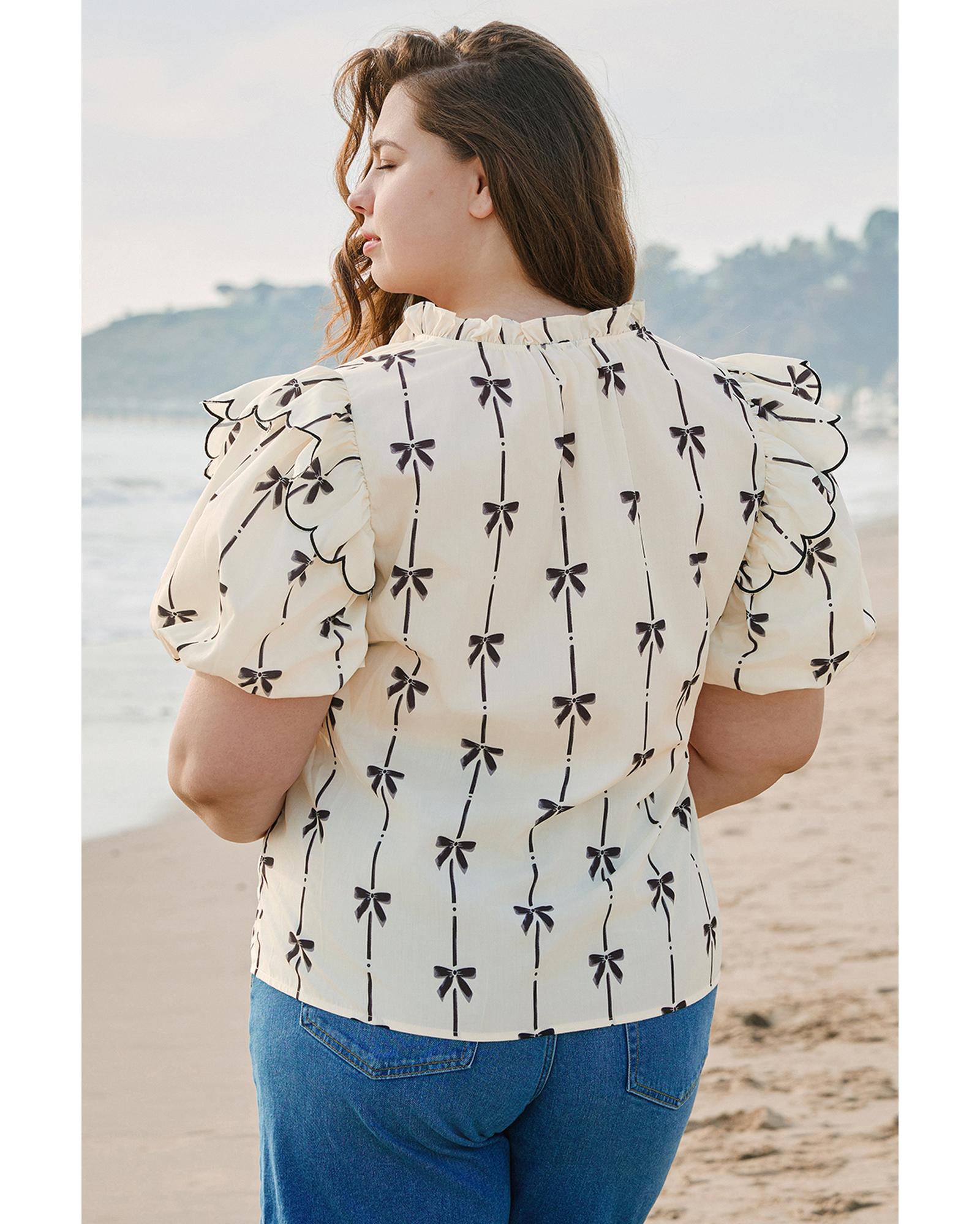 Apricot Bow Printed Ruffled Bubble Sleeve Lace-up Notched Neck Plus Size Blouse – 1X