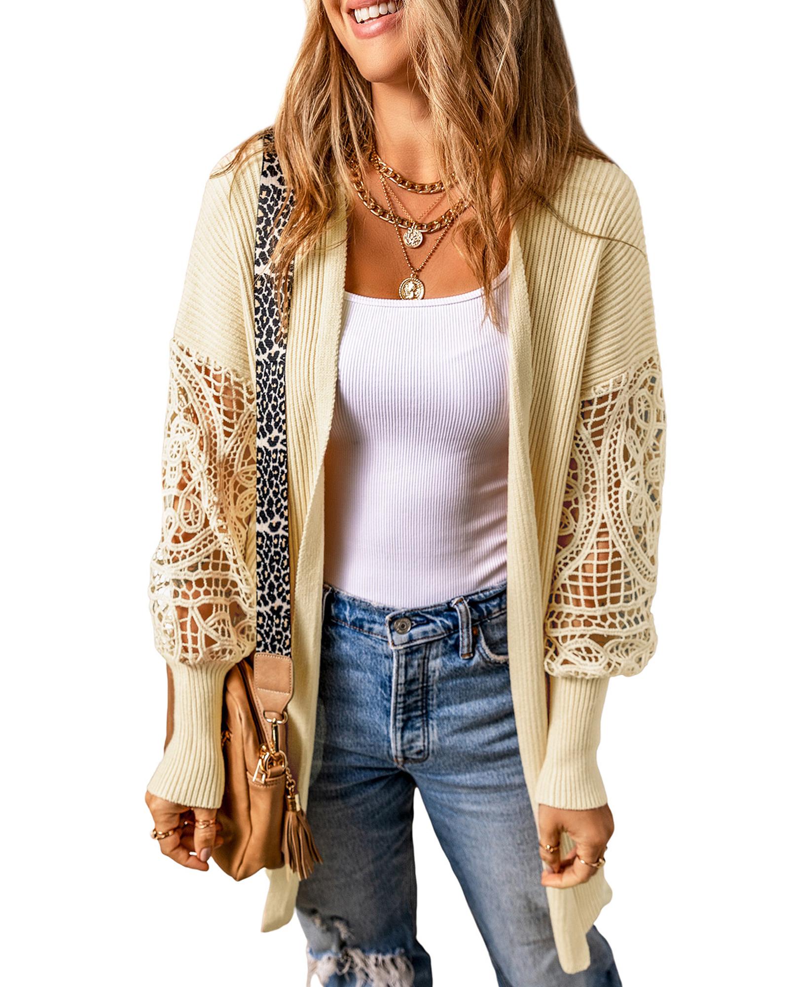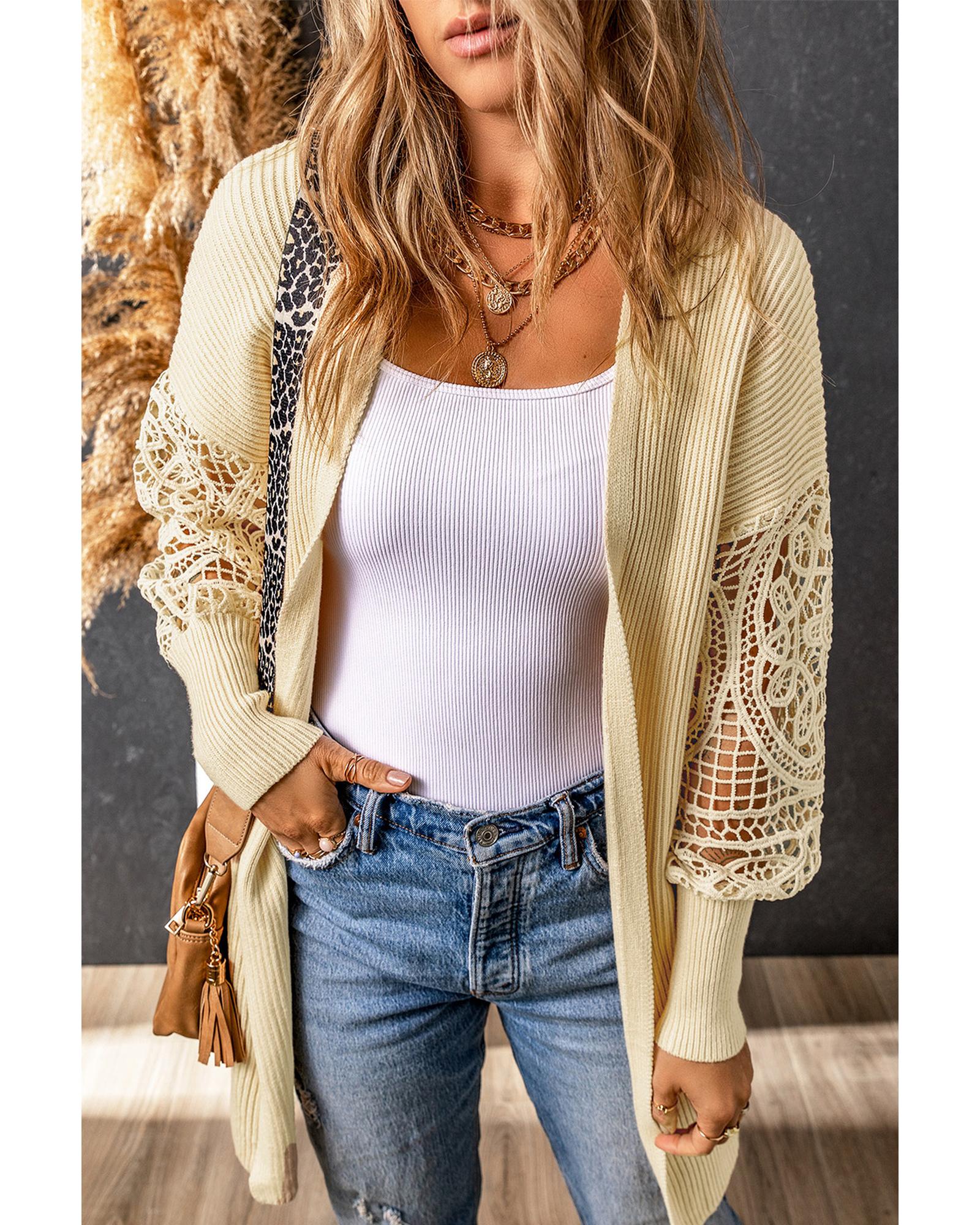 Apricot Crochet Lace Sleeve Ribbed Knit Cardigan – M