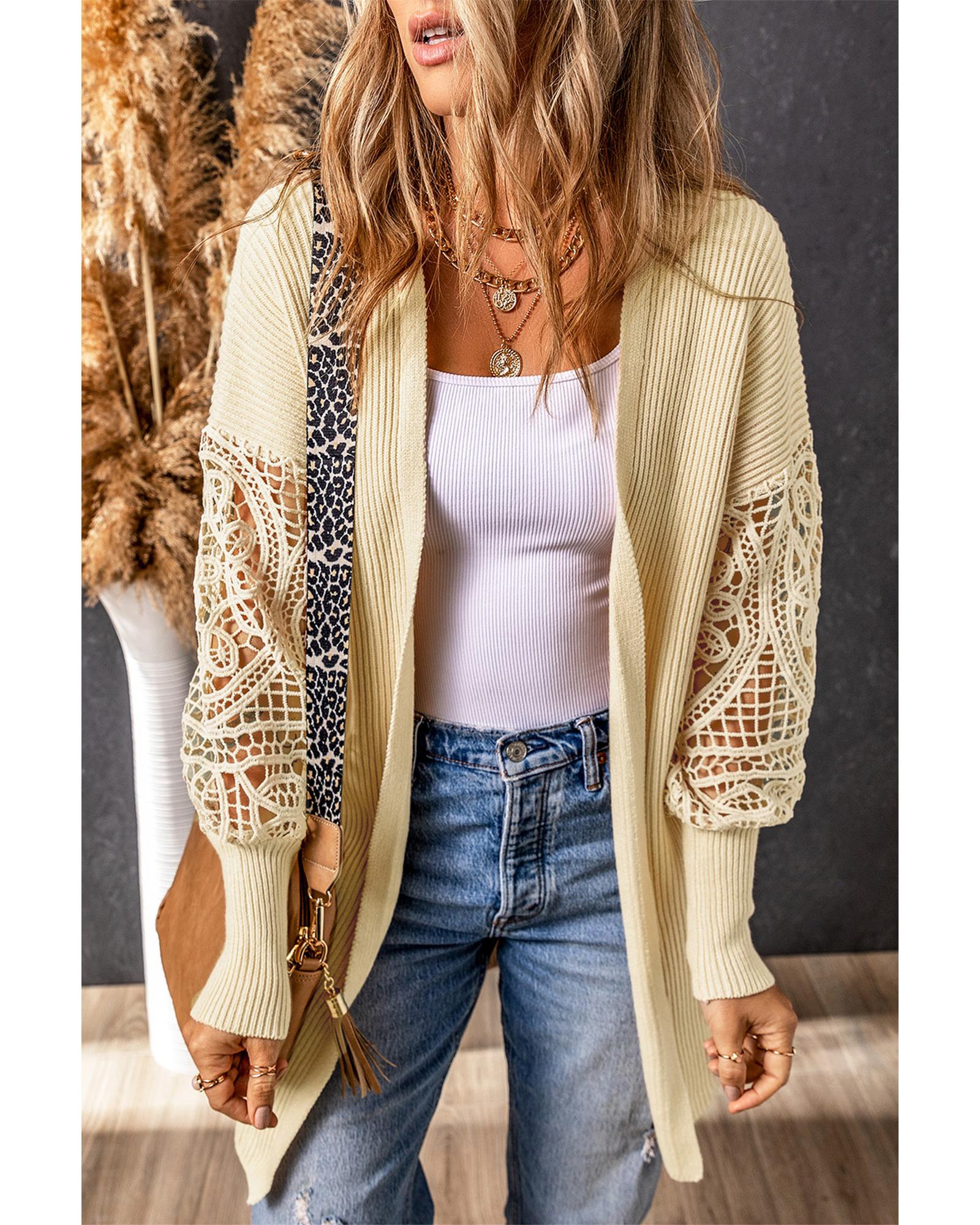 Apricot Crochet Lace Sleeve Ribbed Knit Cardigan – XL