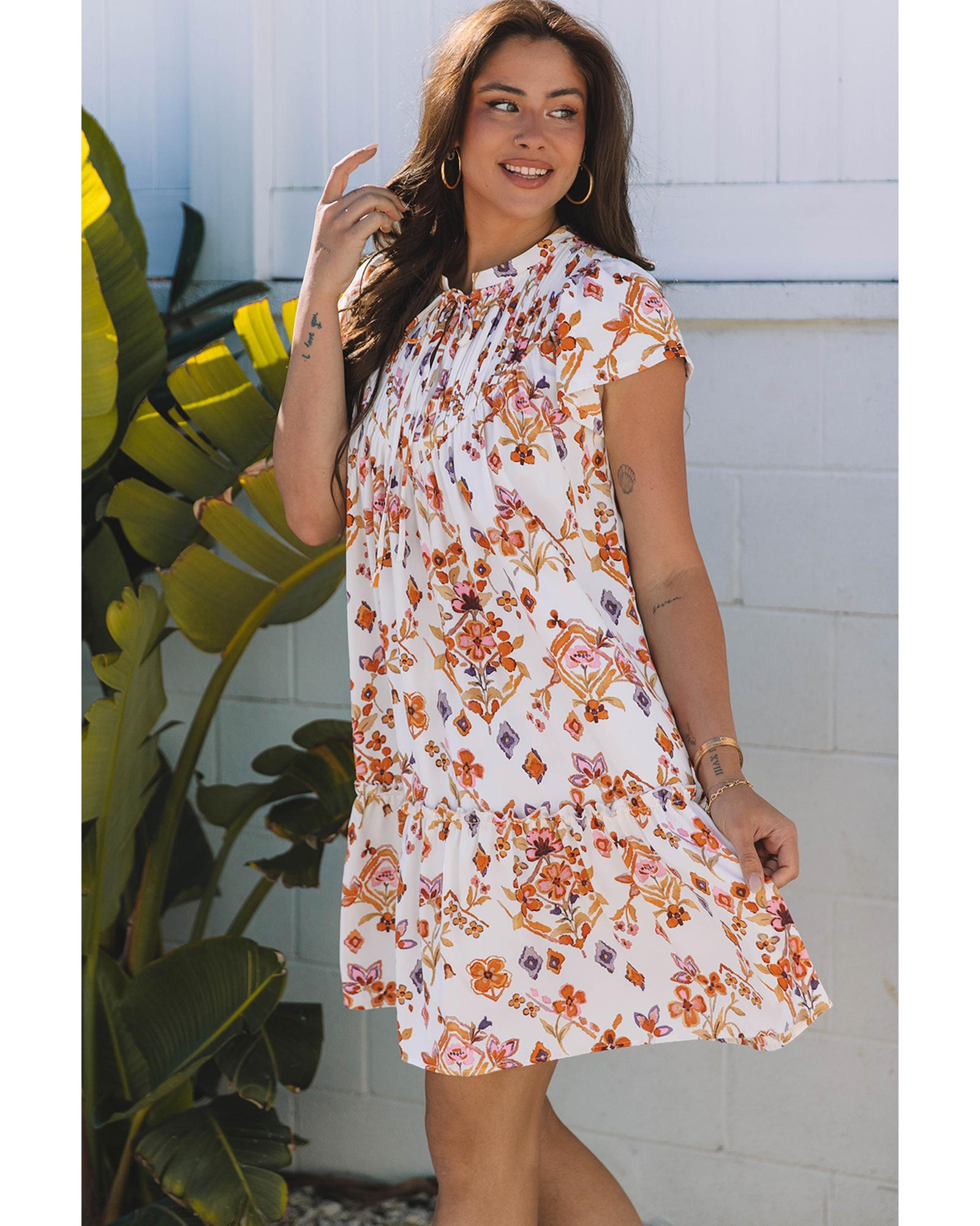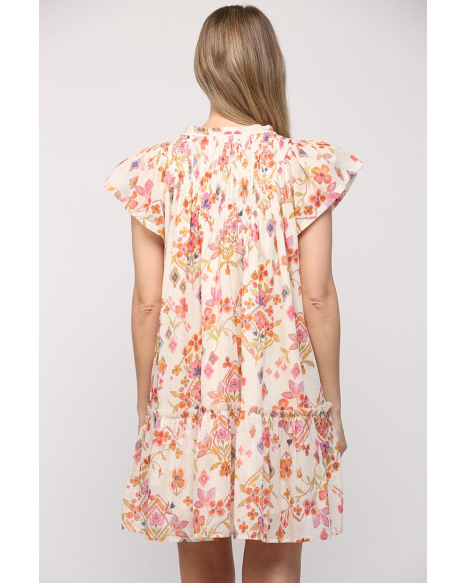Apricot Floral Geometric Print Ruffled Trim Flutter Sleeve Mini Dress – L
