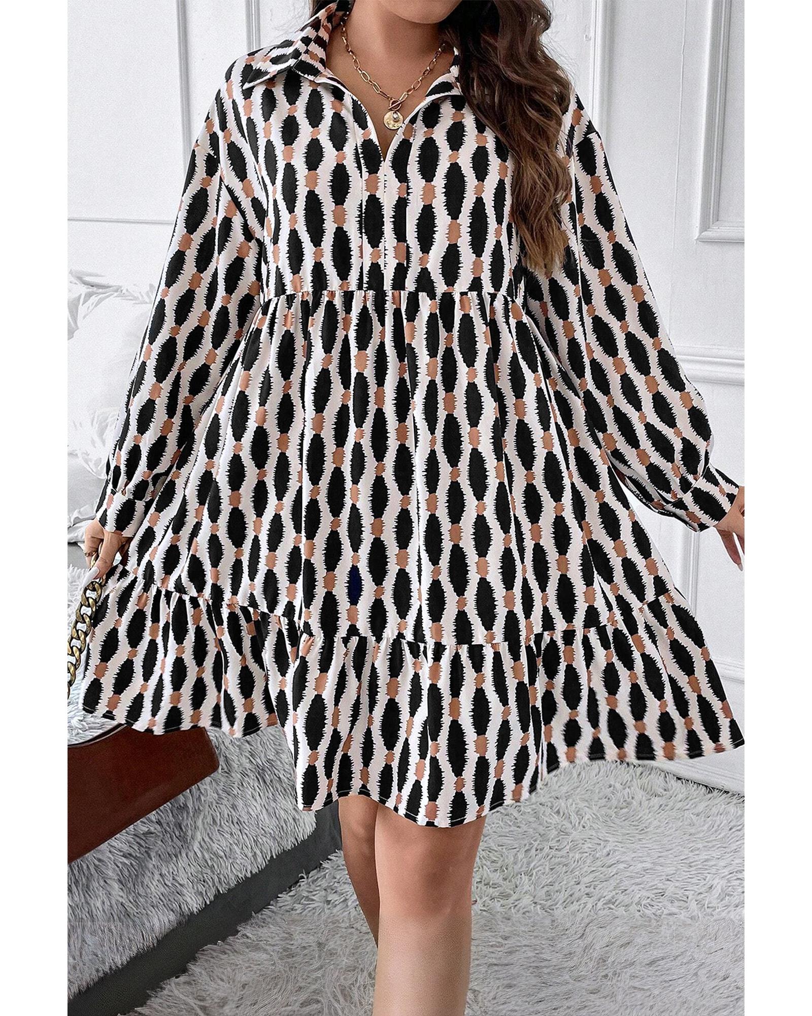 Apricot Geometric Print Collared V Neck Plus Size Mini Dress – 2X
