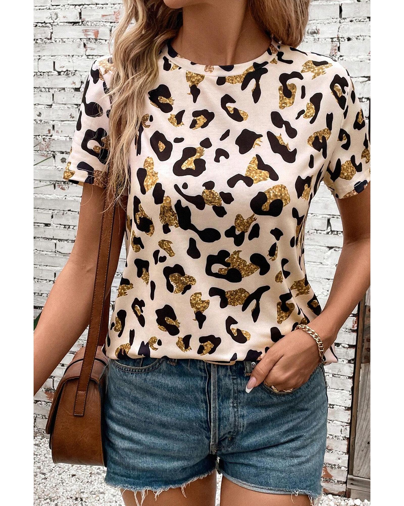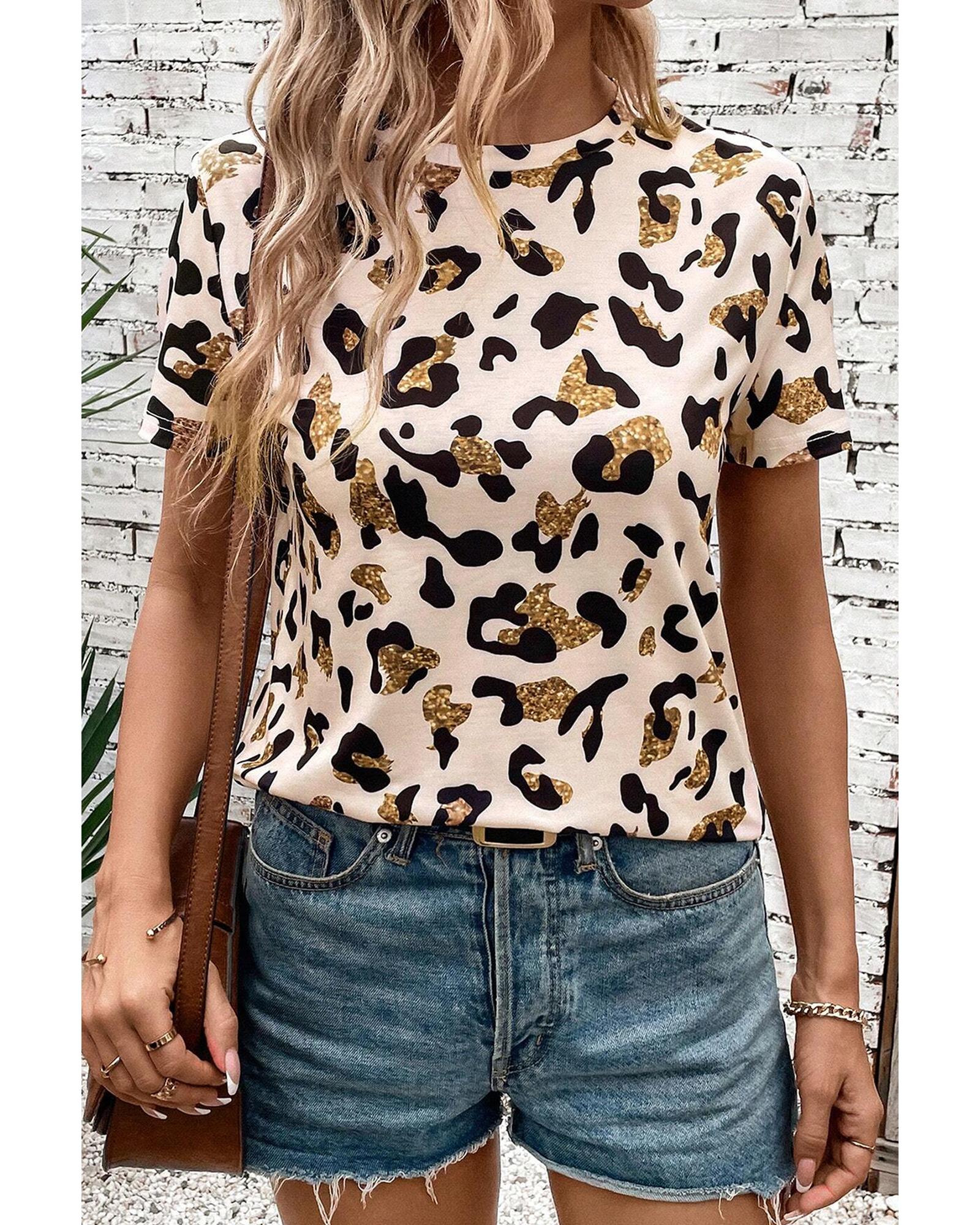 Apricot Leopard Print Round Neck Casual T Shirt – XL