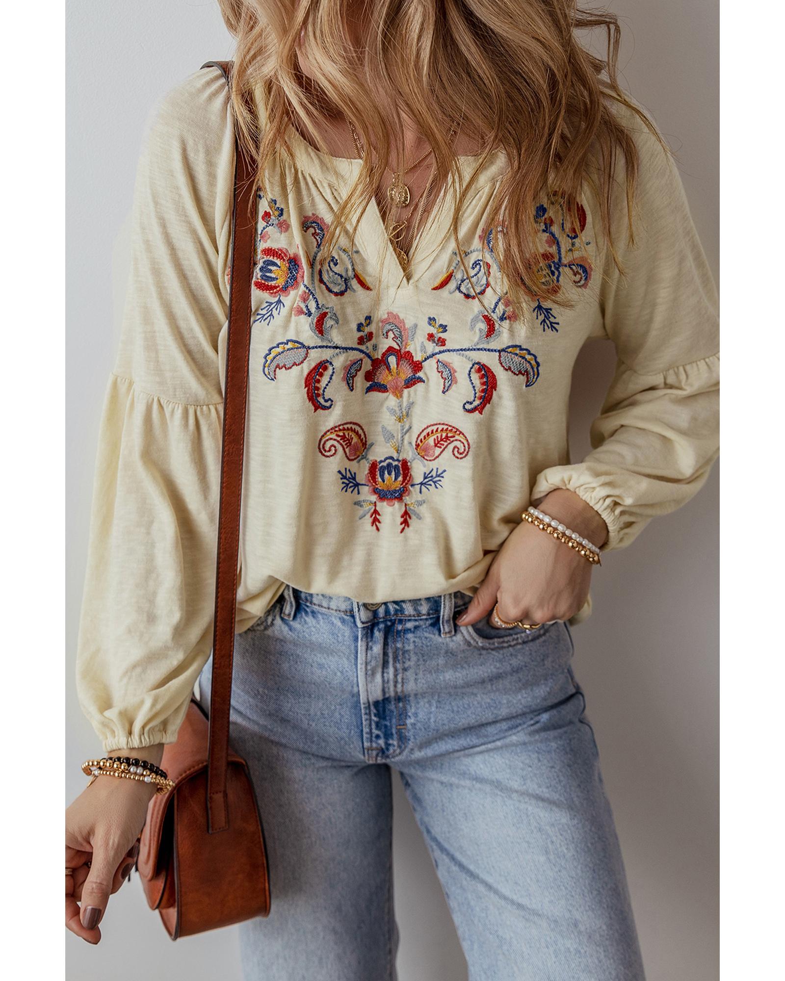 Apricot Paisley Floral Embroidered Notch V Neck Blouse – L