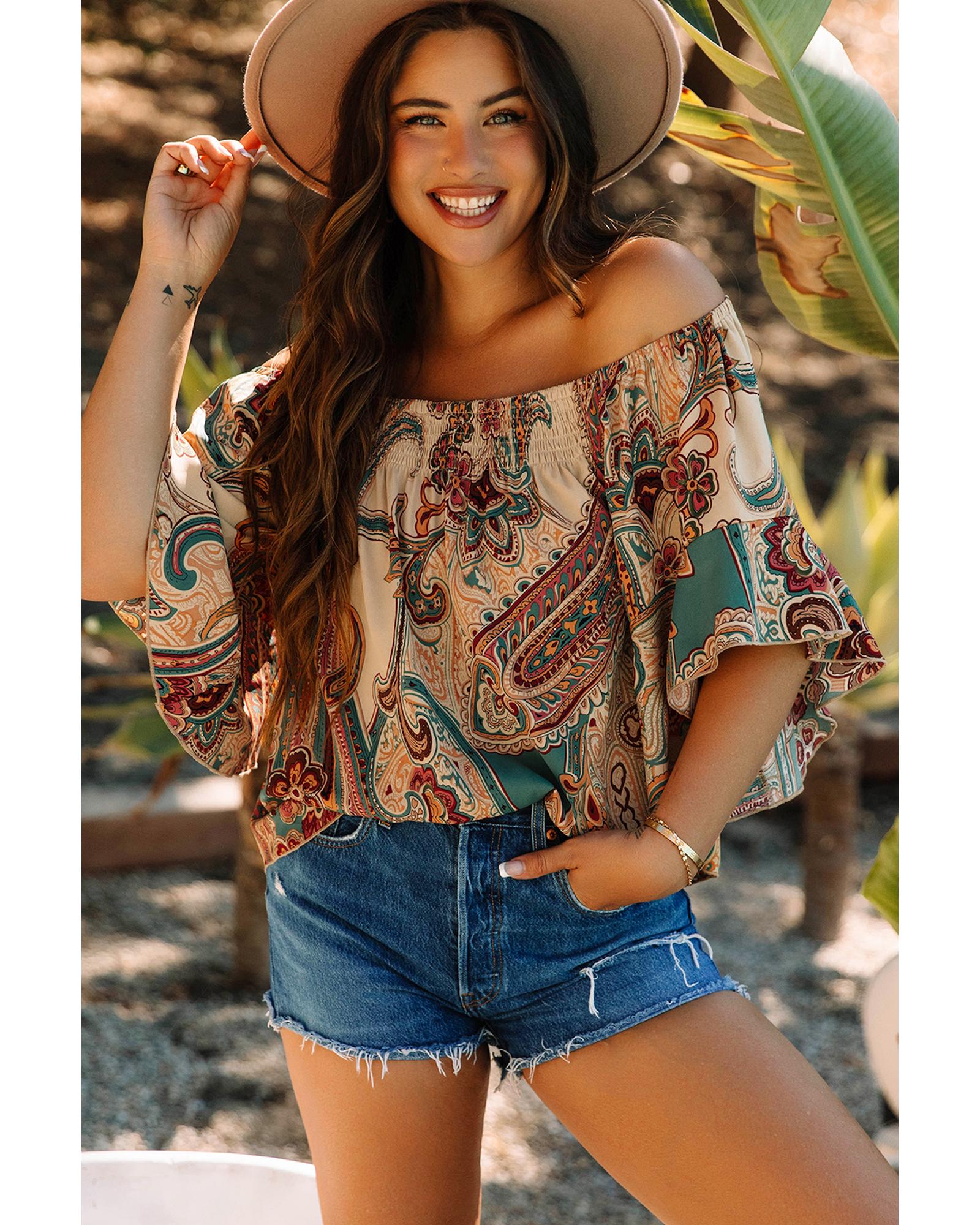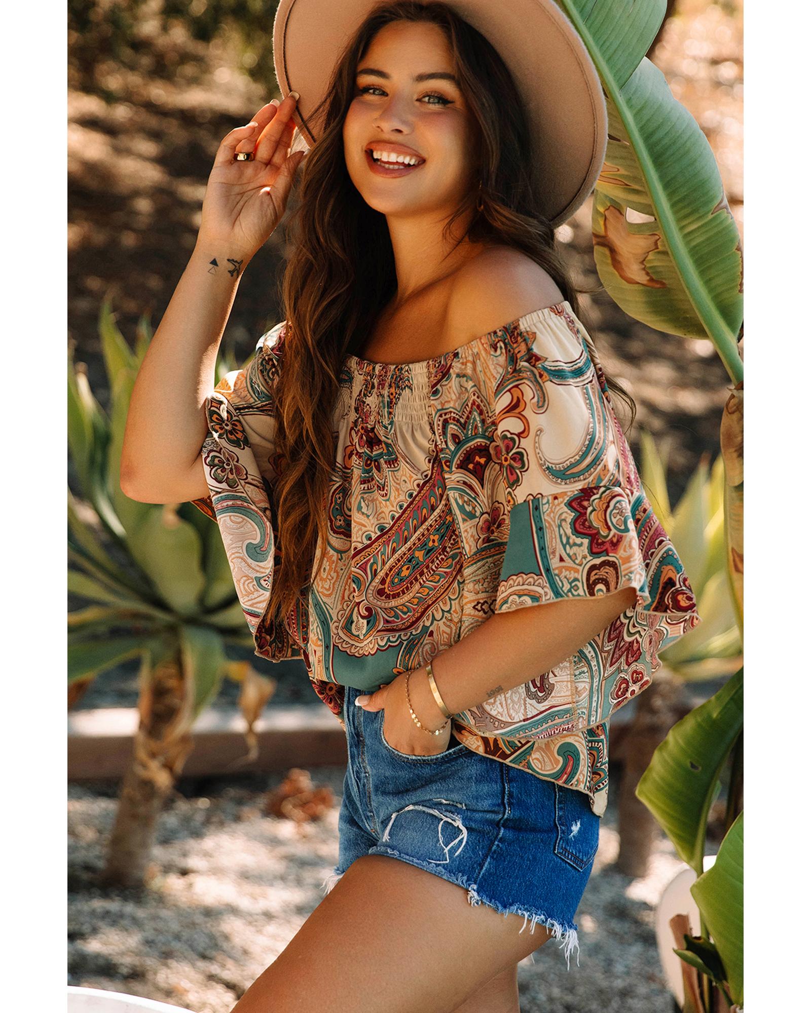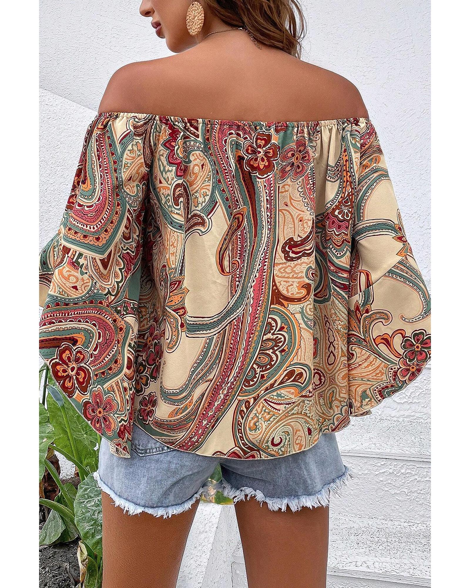 Apricot Paisley Printed Shirred Off Shoulder Ruffled Draped Sleeve Blouse – L