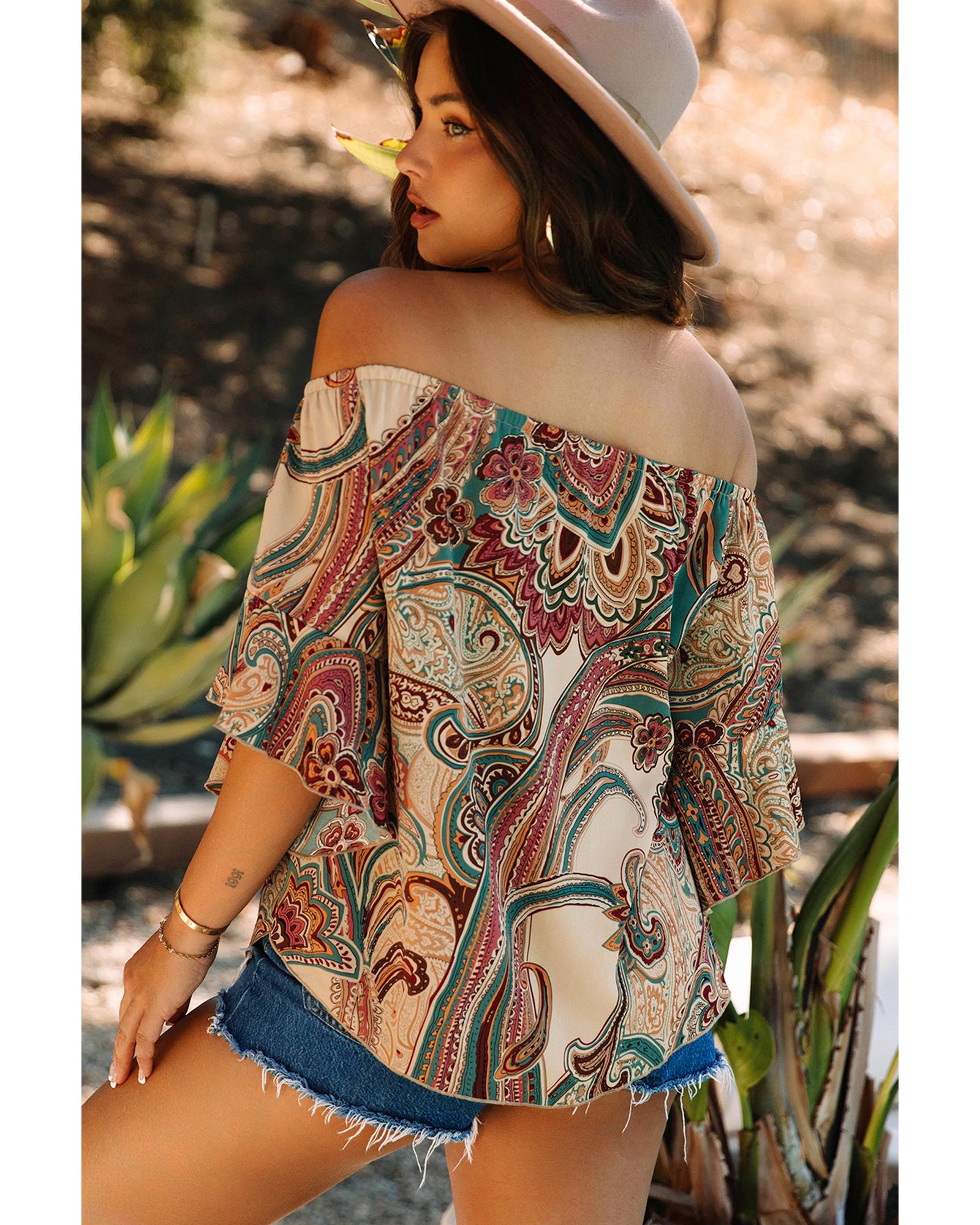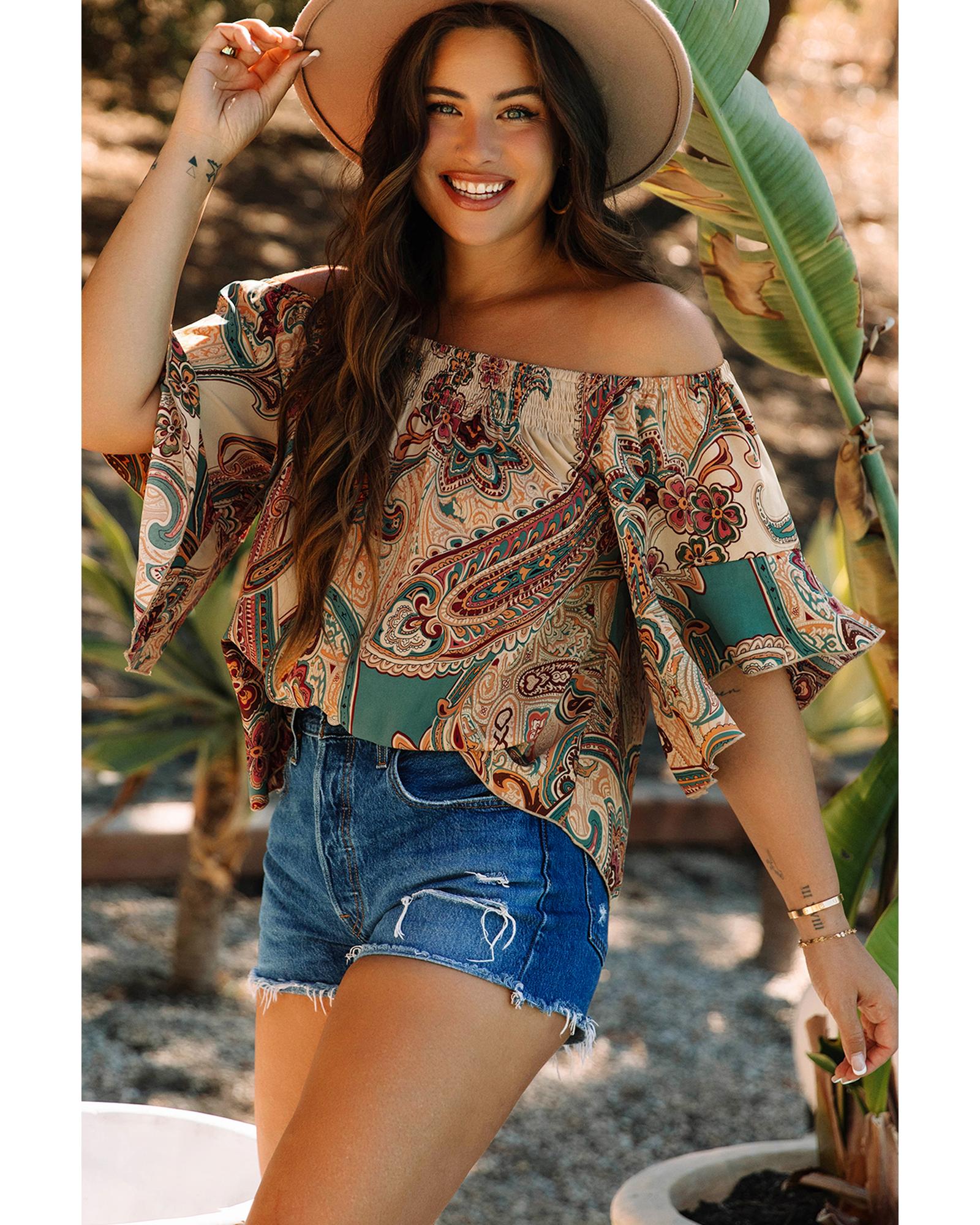 Apricot Paisley Printed Shirred Off Shoulder Ruffled Draped Sleeve Blouse – M
