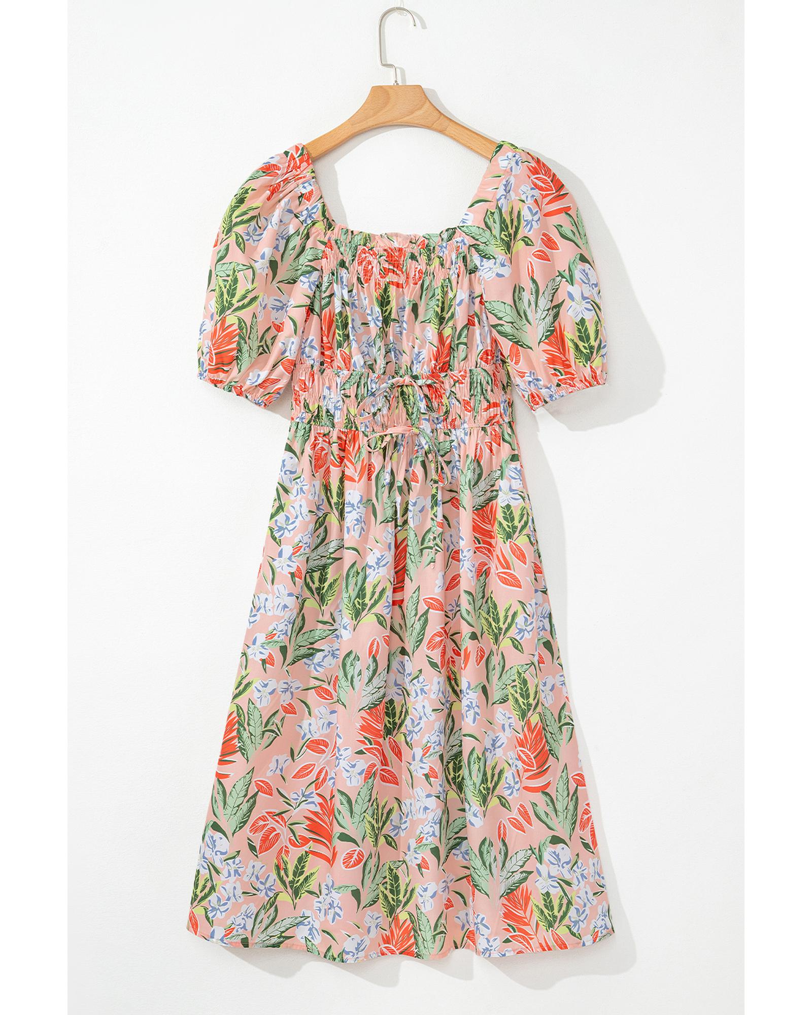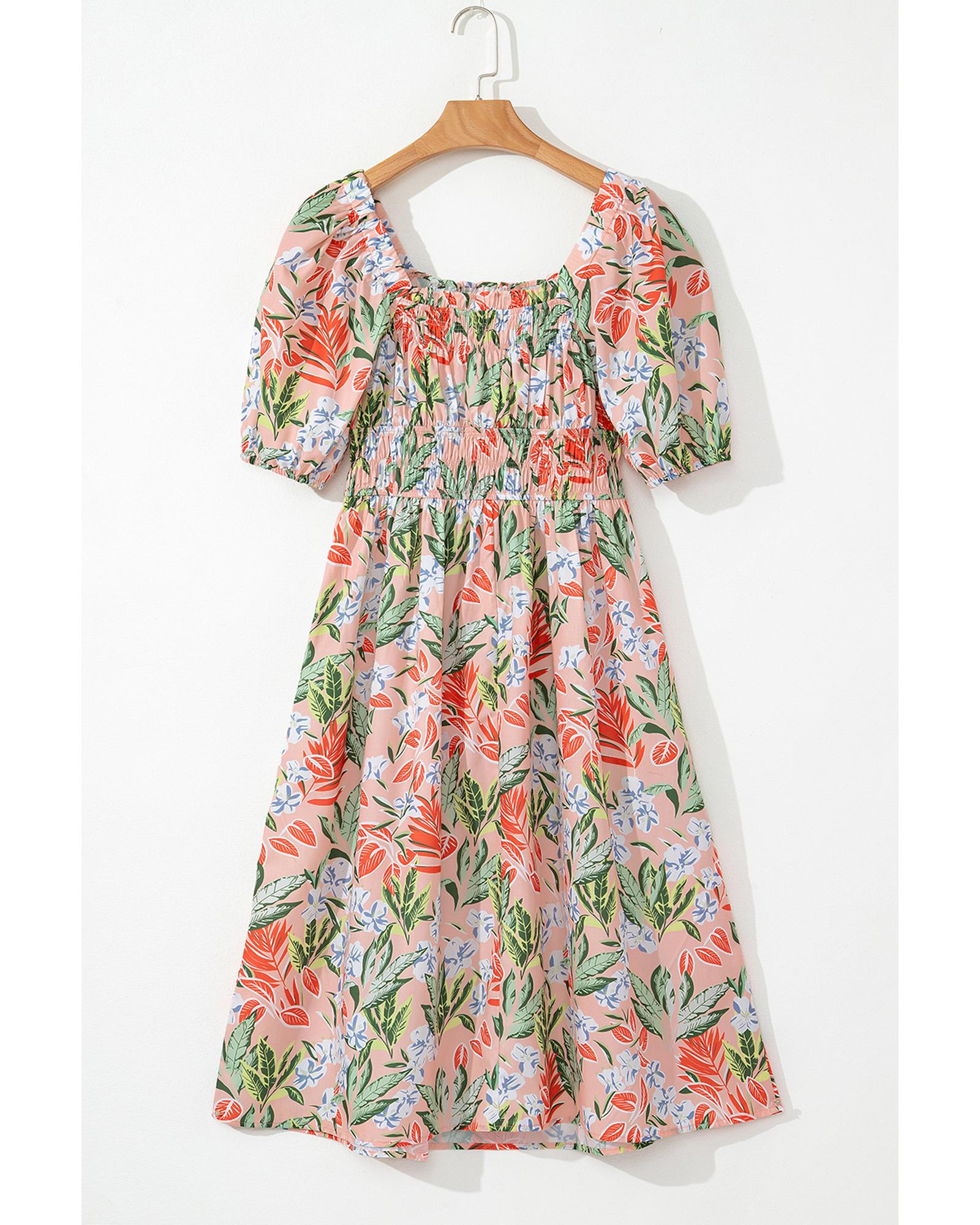 - Apricot Pink Floral Smocked Bust Bubble Short Sleeve Maxi Dress