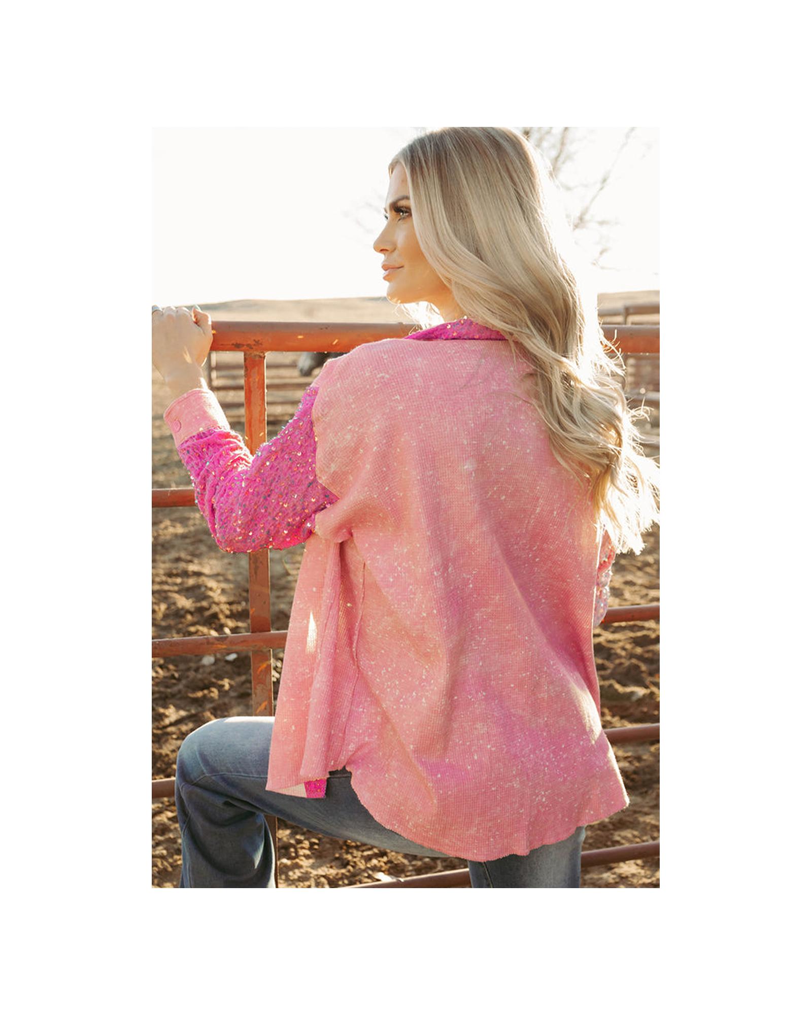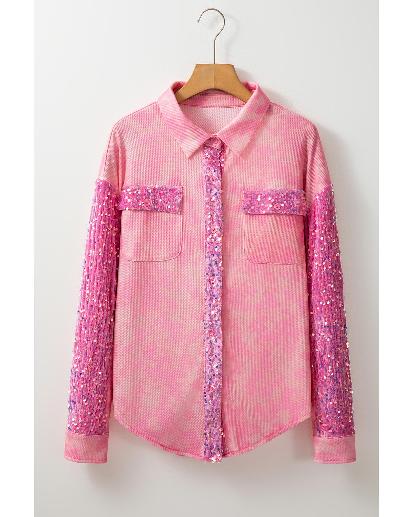 Apricot Pink Mineral Wash Sequin Patchwork Flap Pocket Shacket - S Original price was: $83.99.Current price is: $45.99.