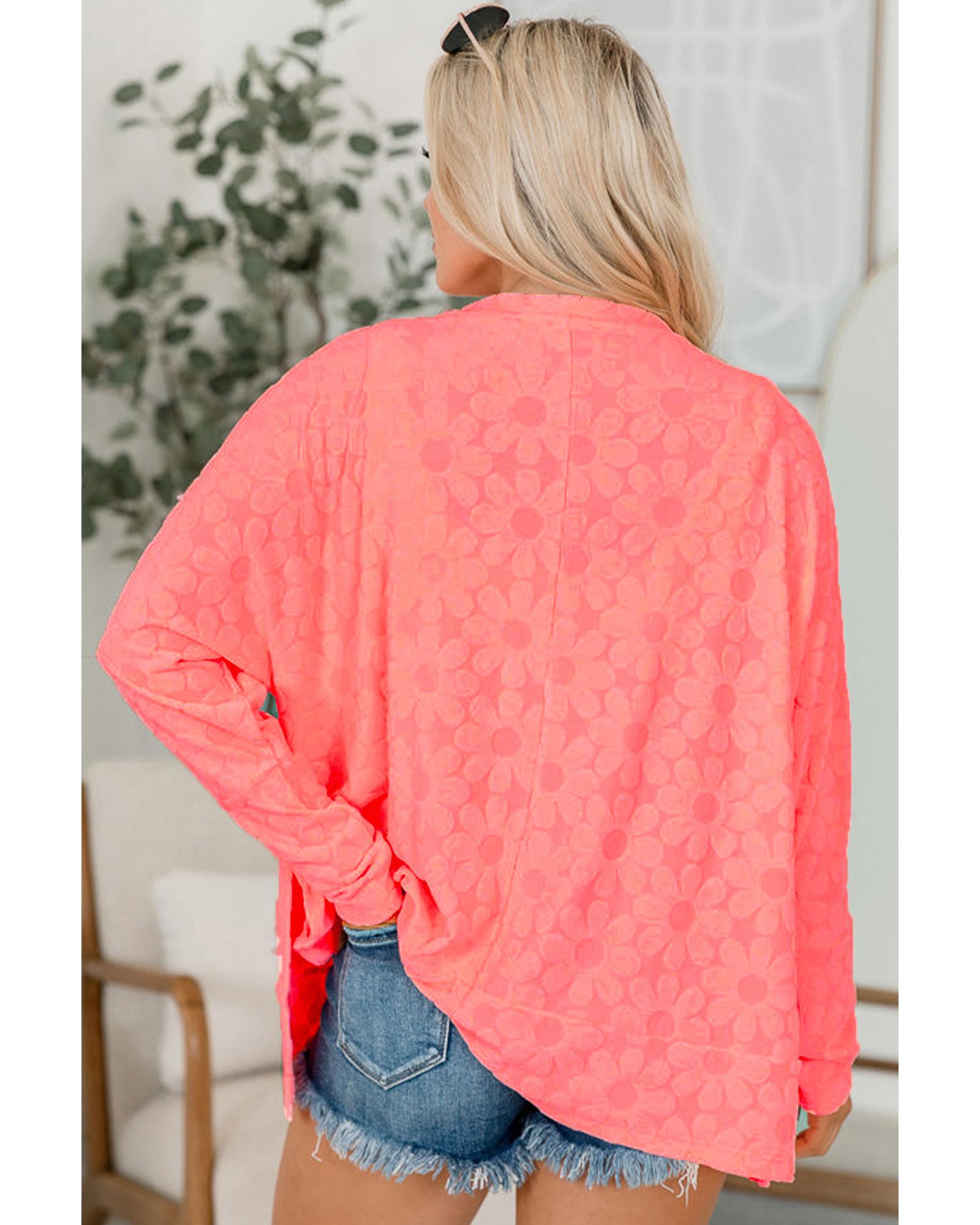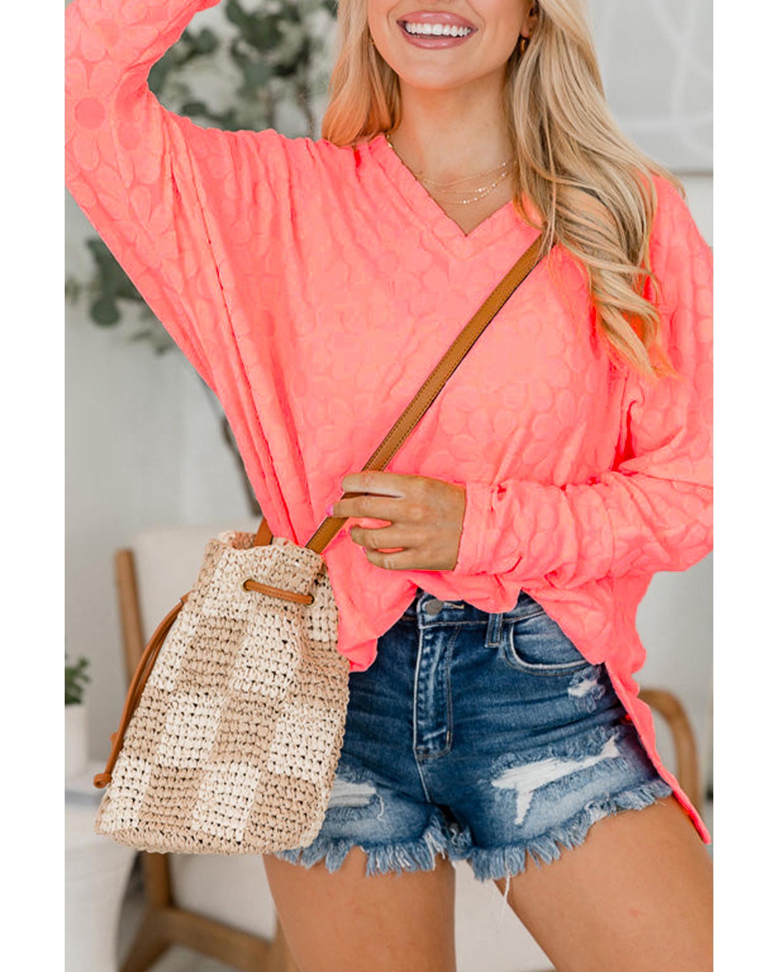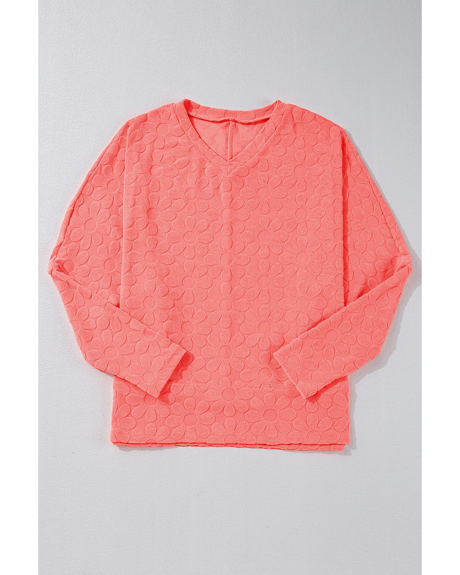 Apricot Pink Oversized Floral Jacquard V Neck Long Sleeve Top – S