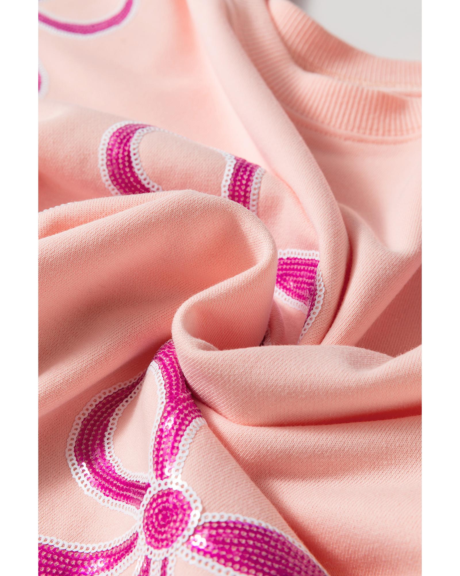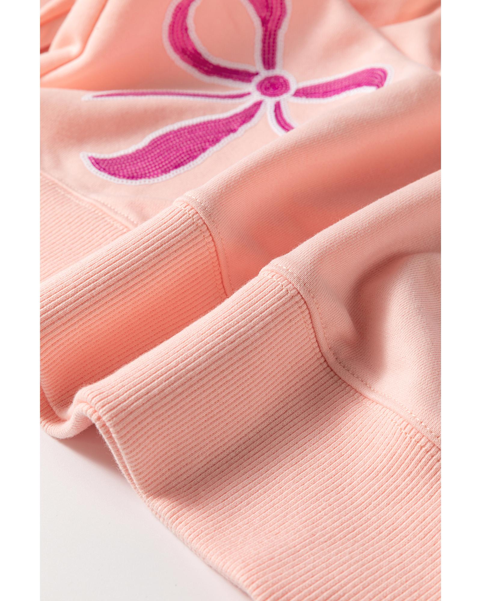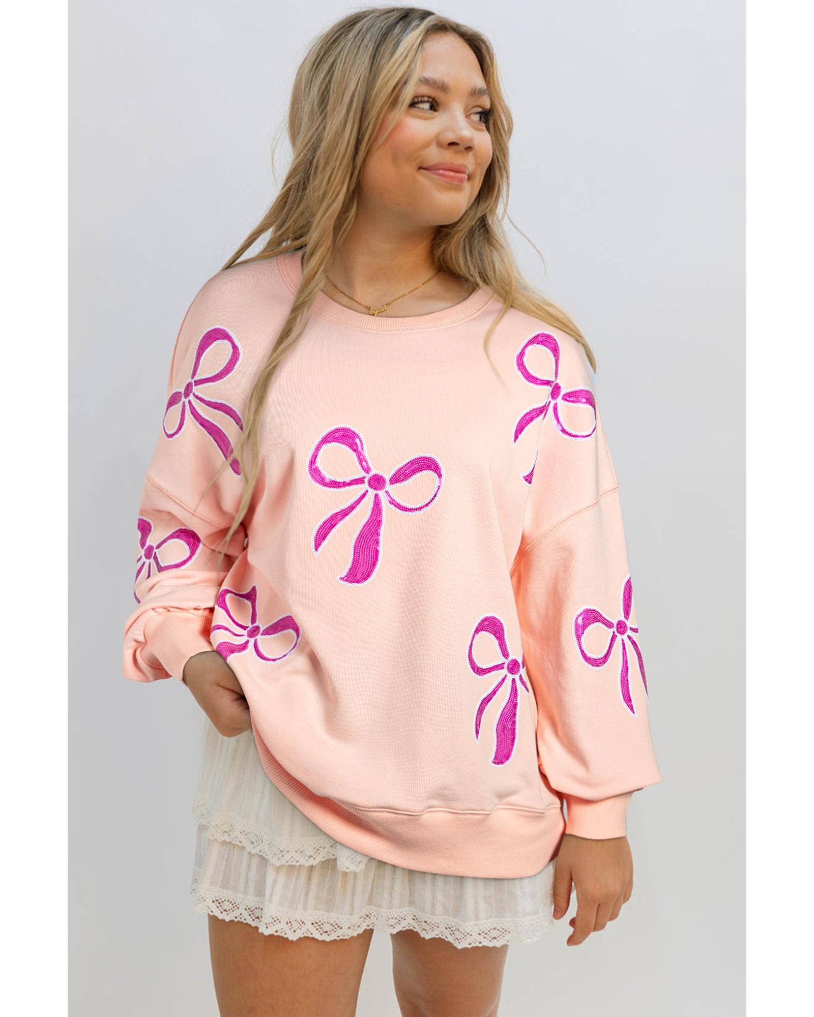 Apricot Pink Sequined Bowknot Drop Shoulder Oversized Sweatshirt – L
