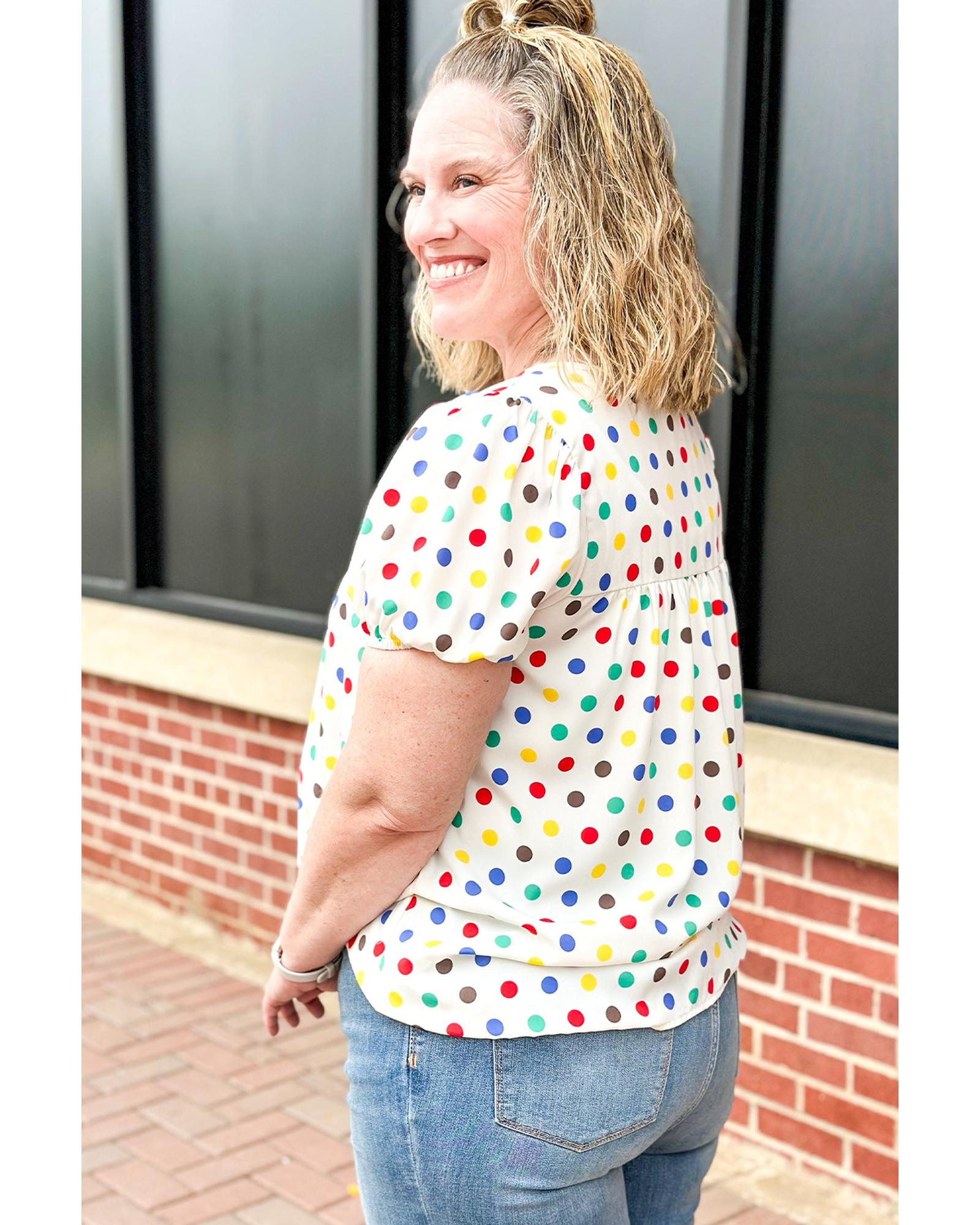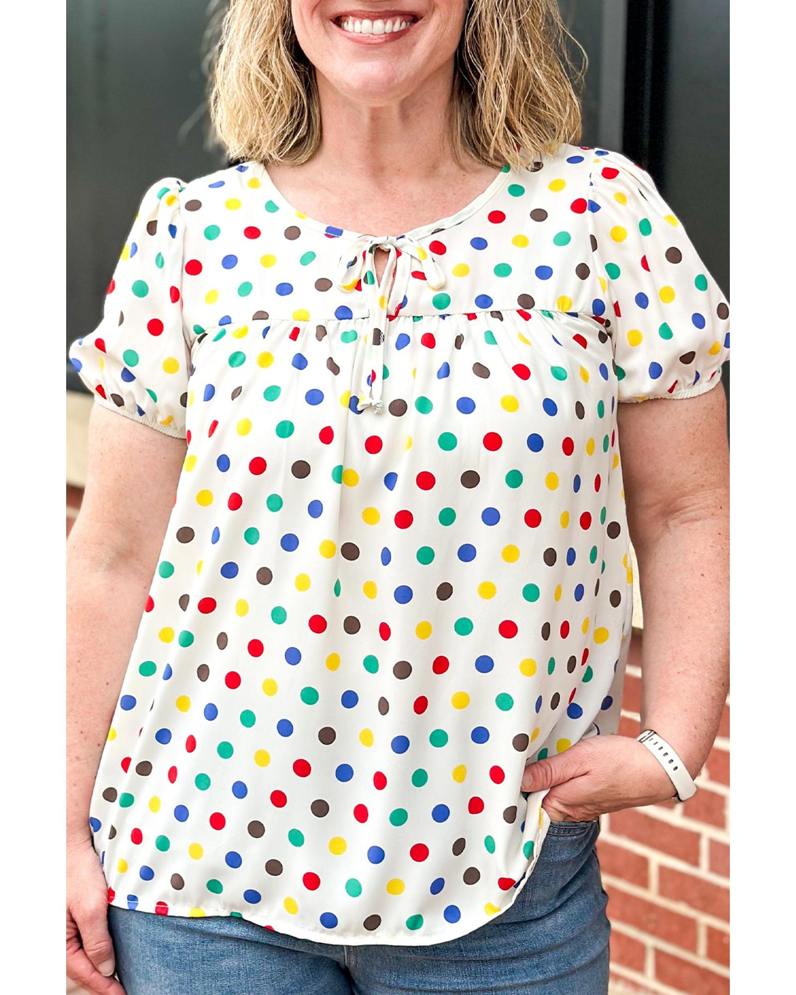 Apricot Plus Size Colorful Polka Dots Tie Neck Puff Sleeve Blouse – 2X