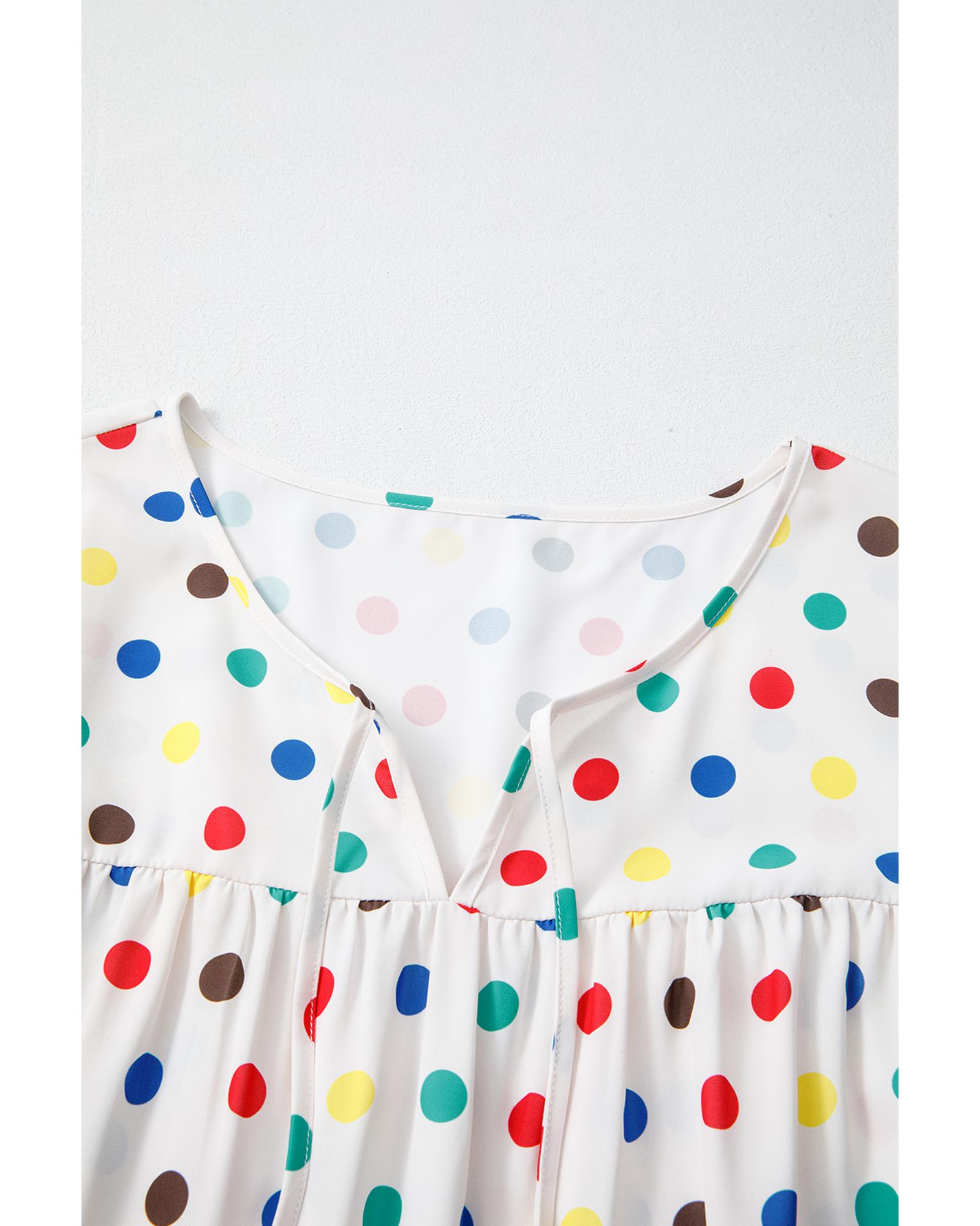 Apricot Plus Size Colorful Polka Dots Tie Neck Puff Sleeve Blouse - 3X