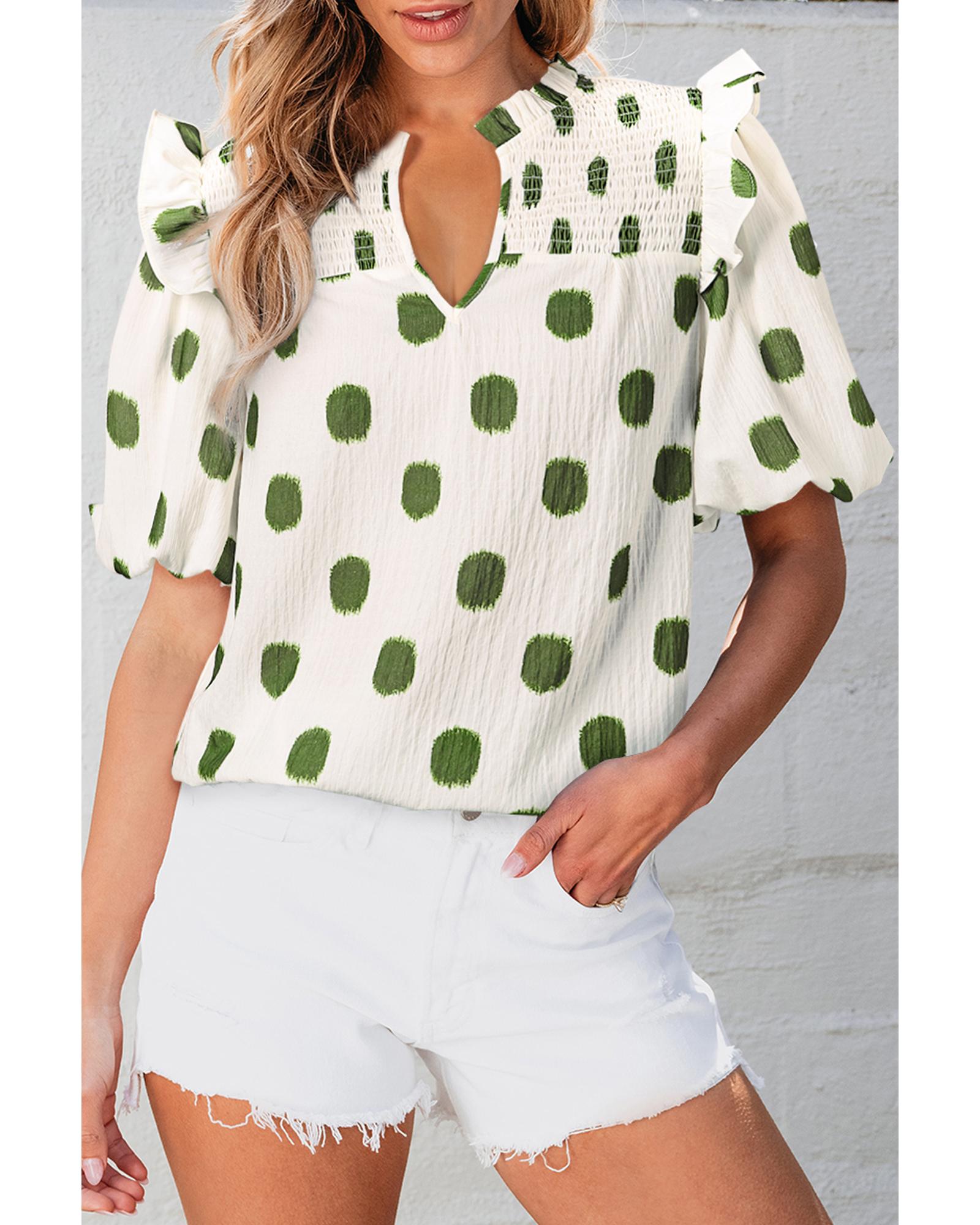 Apricot Polka Dot Print Shirred Yoke Notched Neck Balloon Sleeve Blouse – L