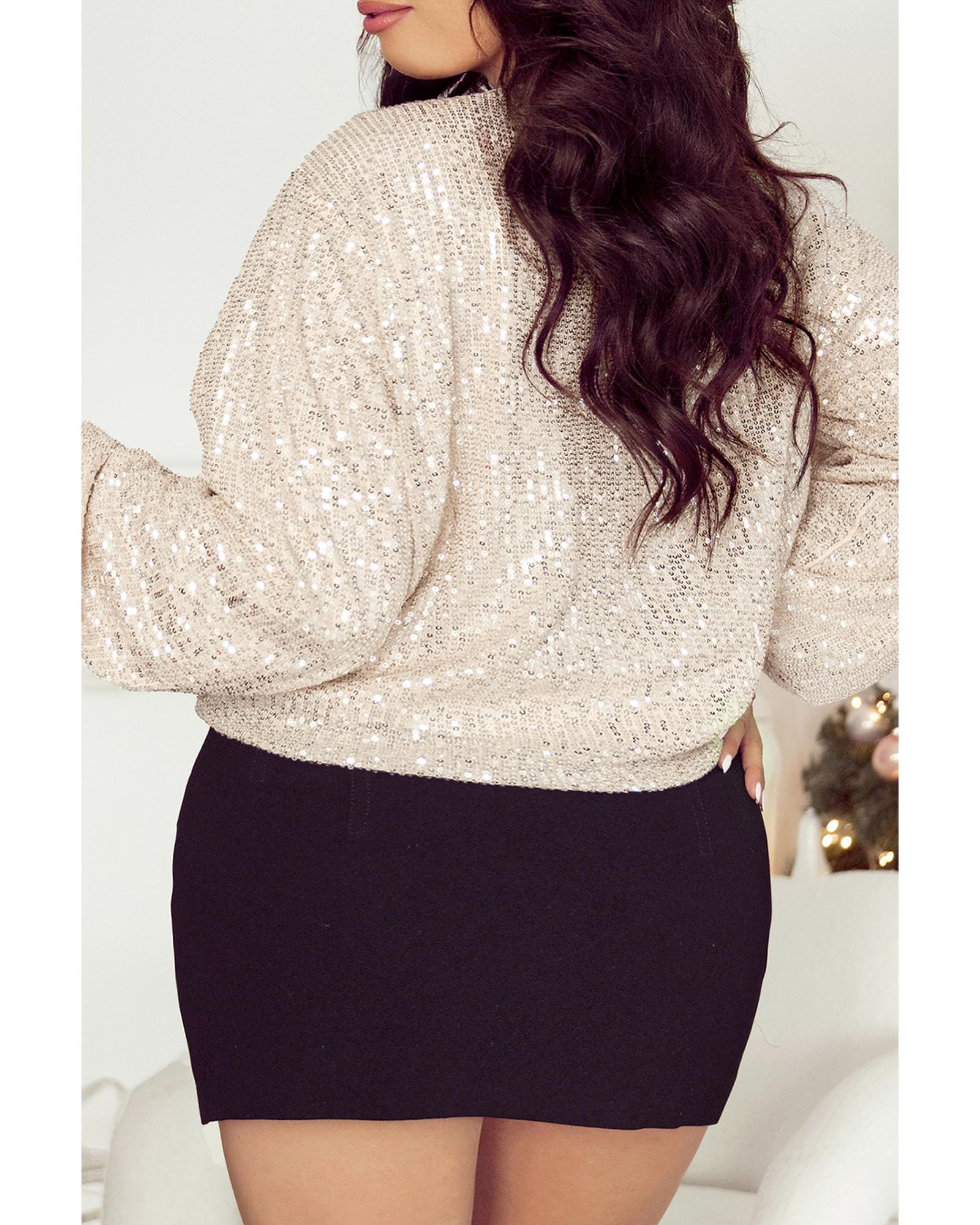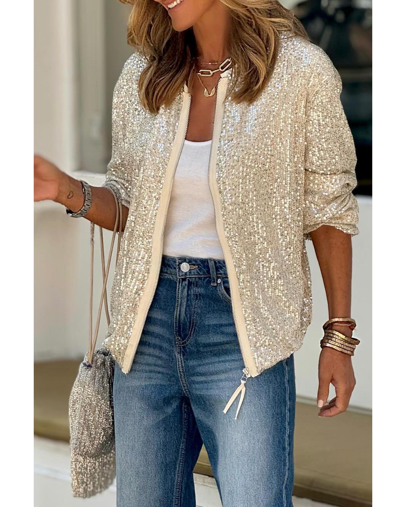 Apricot Sequin Zip up Round Neck Long Sleeve Jacket – XL